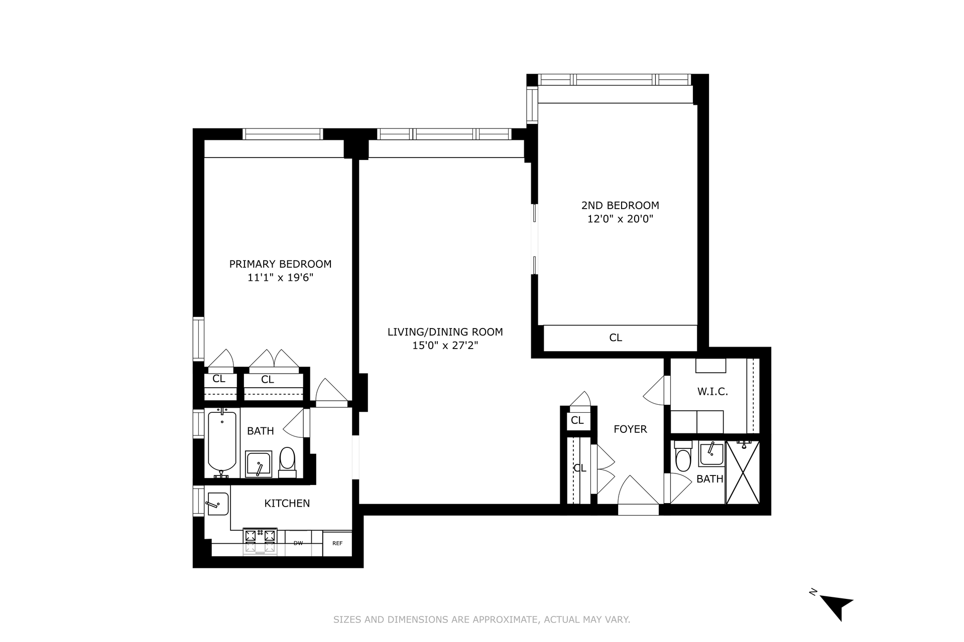 The bright corner primary bedroom offers dual northern and western exposures and features custom built-ins for exceptional storage. The versatile second bedroom, complete with oversized windows, recessed lighting, and additional built-ins, easily adapts as a guest room, home office, or media space. Two beautifully finished bathrooms include a newly renovated, windowed bath with refined quartz tile and polished nickel accents, as well as a second full bath clad in rich dark marble with a glass-enclosed shower.