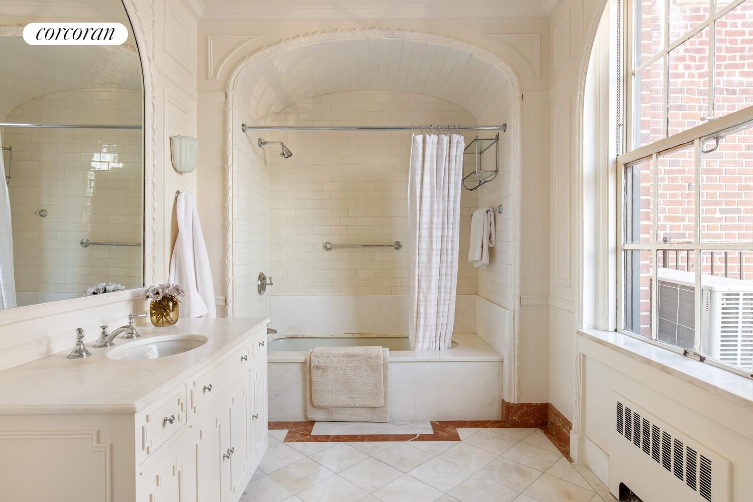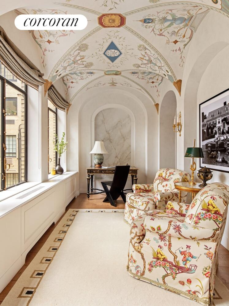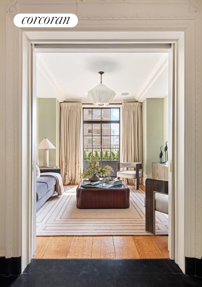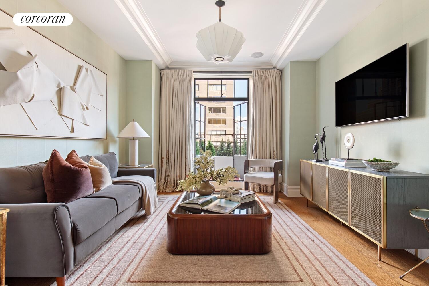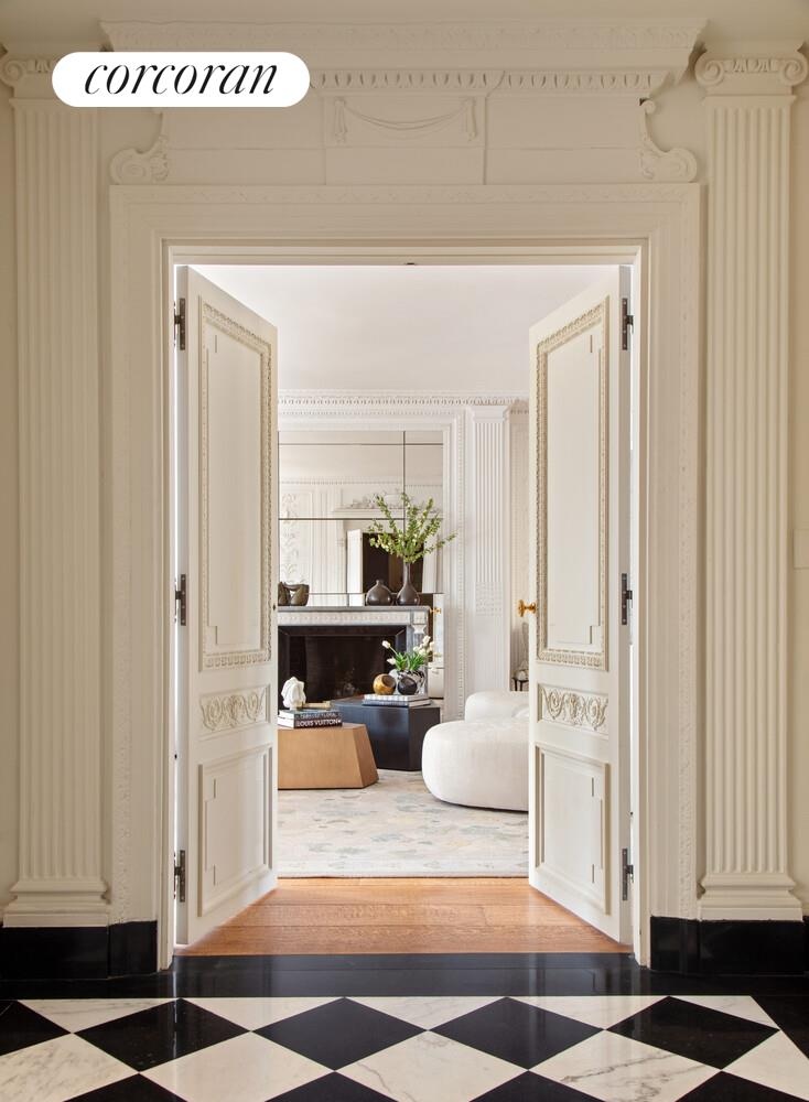 A semi-private elevator landing opens to a stately gallery that sets an elegant tone and seamlessly introduces the entertaining spaces. The grand expanse includes an east-facing living room centered around a wood-burning fireplace with marble mantel, and a sun-filled conservatory with three oversized west-facing windows offering enchanting light and distant glimpses of Central Park.