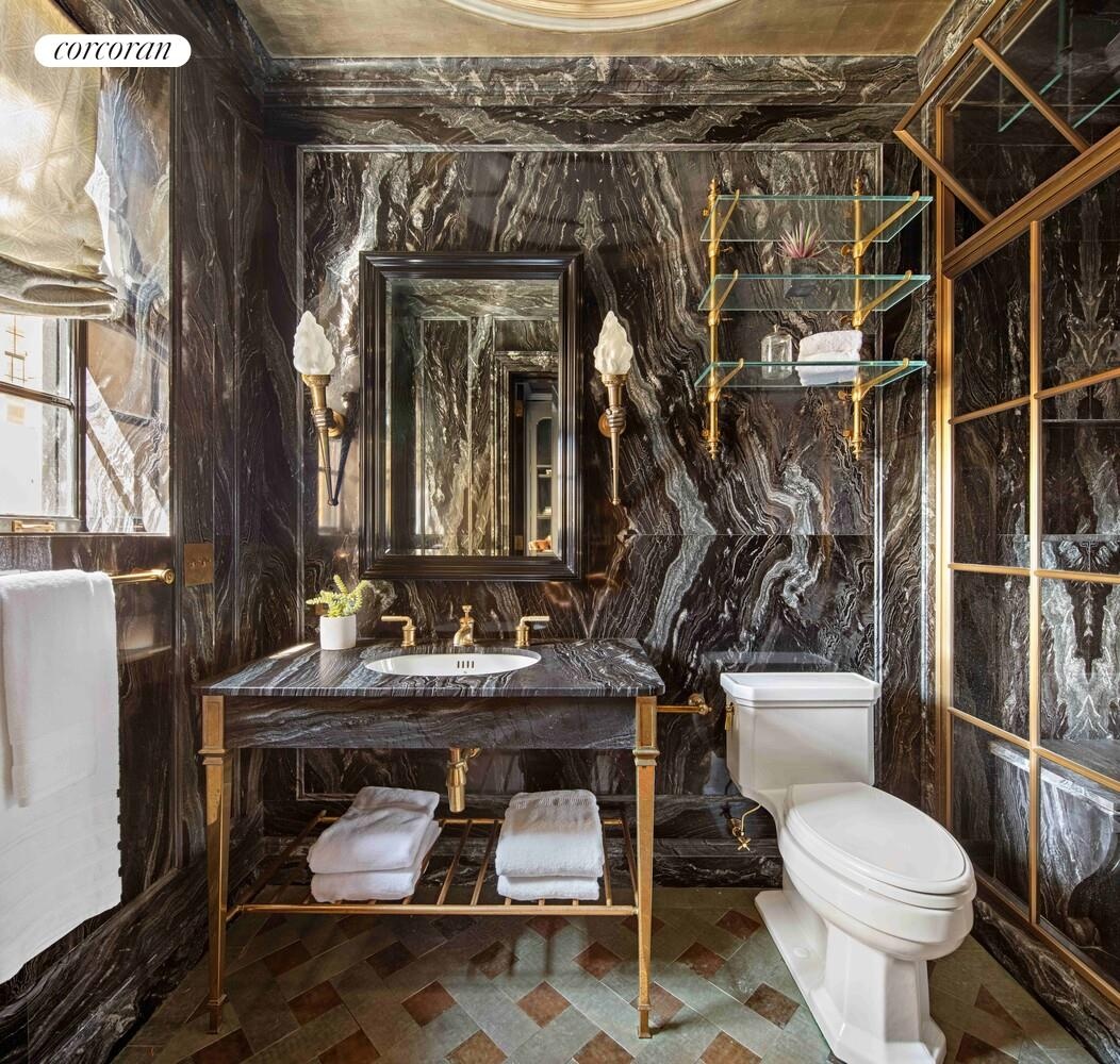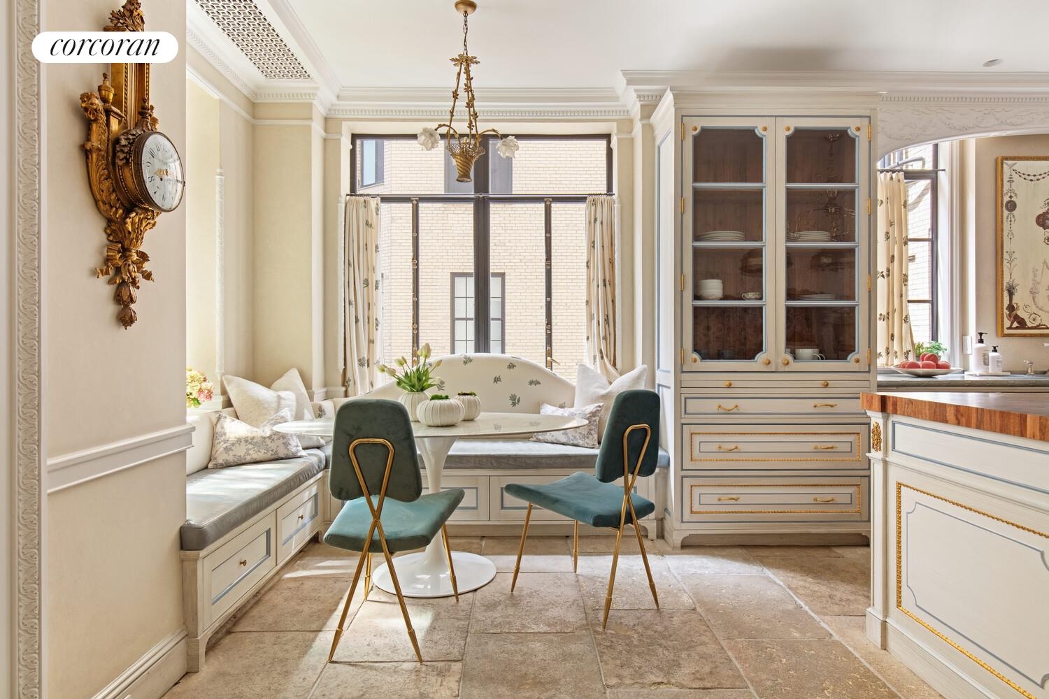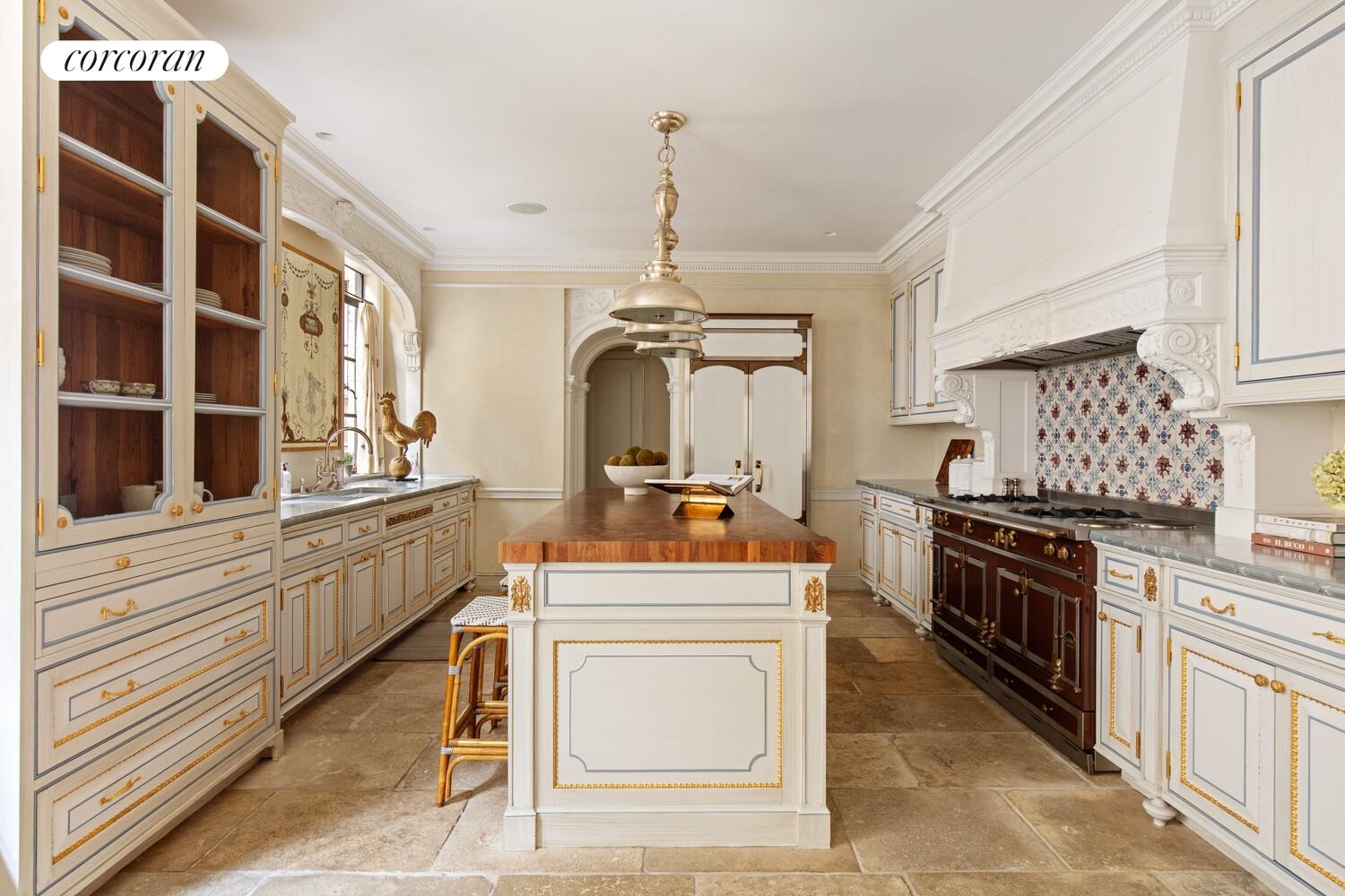 A hand-painted powder room is discreetly positioned off the gallery. The state-of-the-art chef's kitchen is designed for both serious culinary pursuits and everyday living, anchored by a grand mahogany island and complemented by a cozy upholstered banquette seating area that can easily accommodate six. Adjacent service areas include a laundry room, staff quarters with bath, and a thoughtfully designed oversized custom pantry.