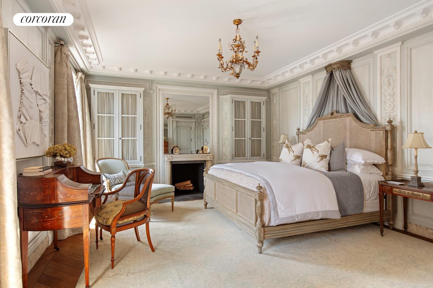 A sweeping staircase ascends to the private level, where the serene bedroom wing offers exceptional comfort and privacy. The expansive 21-foot primary suite features a wood-burning fireplace and opens onto a planted east-facing terrace with open city views. The suite is complemented by a generous walk-in closet and a spacious en-suite bath.