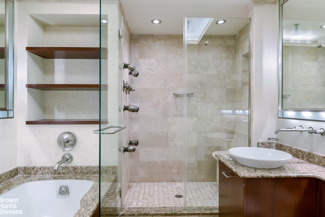The large and sunny corner primary bedroom also showcases floor to ceiling windows and excellent closet space, including a walk-in. The en-suite bath has a soaking tub and a 7 spout shower.