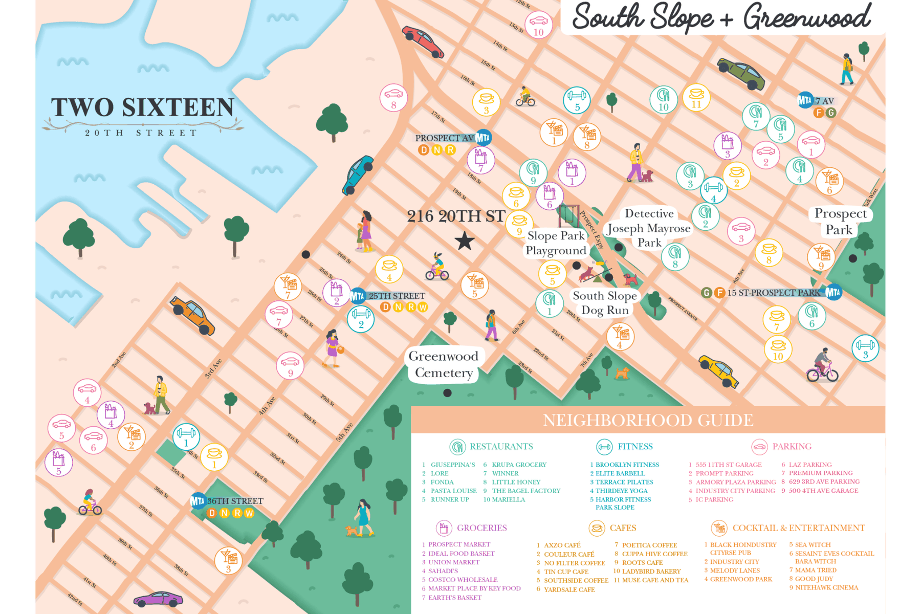 Ideally located between South Slope and Greenwood, Two Sixteen 20th offers a rare blend of neighborhood charm and urban convenience. Enjoy the vibrant dining of 5th Avenue, Nitehawk Cinema, and the green expanses of Prospect Park and Greenwood Cemetery—all within reach. Commute effortlessly via nearby R, F, and G trains, Citibike stations, and multiple parking garages.