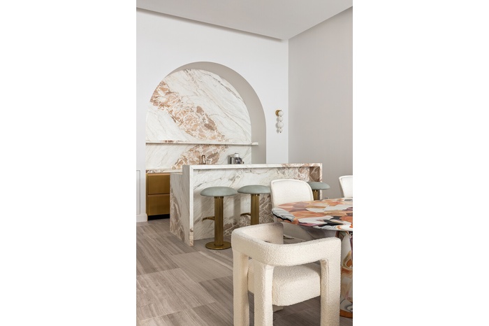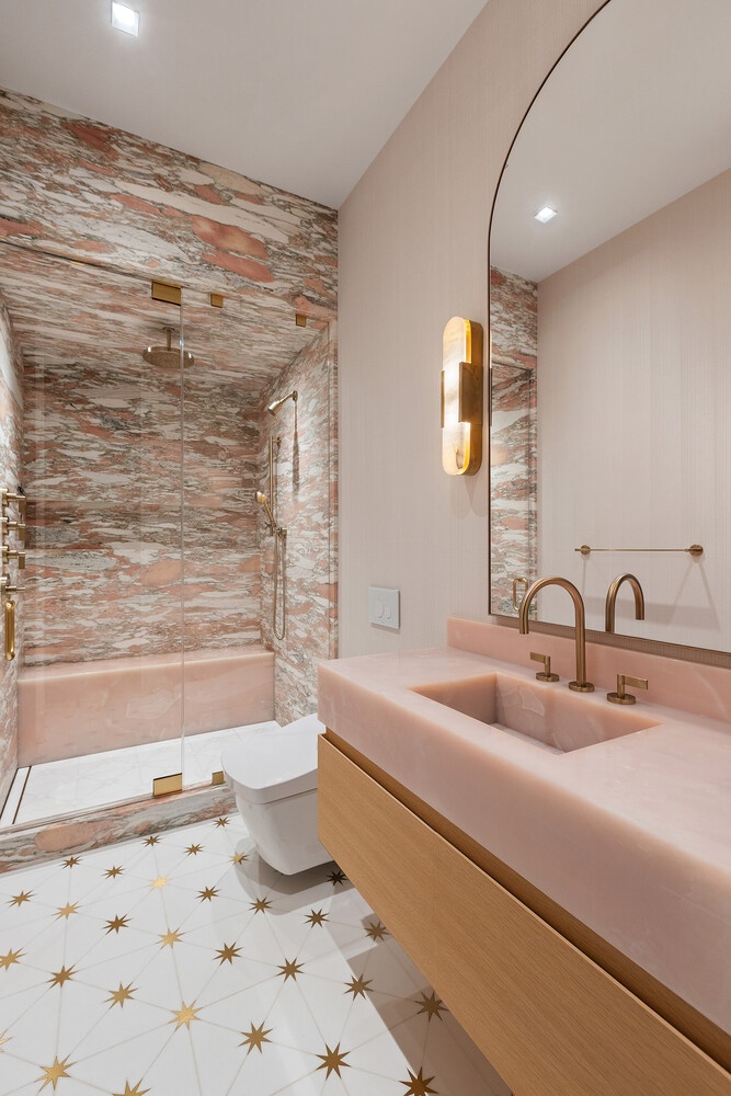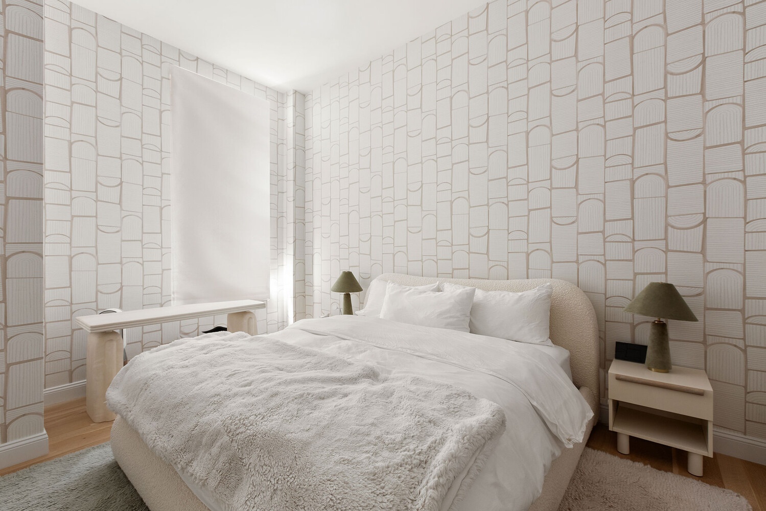 The primary suite is a private world of its own, offering TWO ensuite bathrooms - one with a built-in sauna and soaking tub, the other clad in Valentina-honed marble - and a massive walk-in dressing room with herringbone floors off the primary, includes Holly Hunt Converge wallpaper, and a custom Opera d'Arte marble vanity, built out with all custom woodwork, creating a true dressing-room experience.