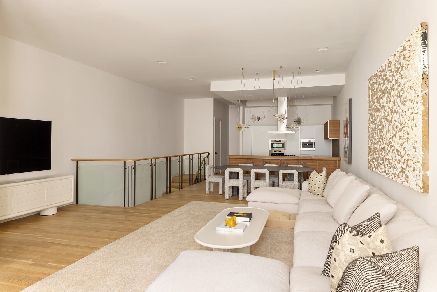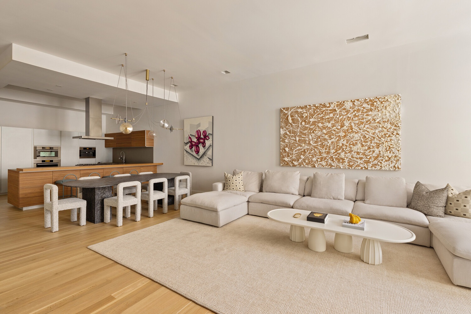 The journey begins in the grand great room, where soaring ceilings and dramatic windows over Spring Street offer a true "WOW EFFECT", and a natural backdrop for art, gatherings, and conversation. At its heart is a Milo Workroom sofa in Holly Hunt fabric and a bespoke Kooij table, crafted in Paris - both available to purchase with the home - paired with a Calacatta Vagil Oro custom bar that turns cocktail hour into theater. This is place where intimate happy hours turn into successful business meetings and memories to cherish. This a place where ideas are built into plans and brought to fruition. The home is a showpiece, it's quiet despite being in the heart of one of the most amazing locations in NYC and at the doorstep of iconic world class dining, shopping, and nightlife.