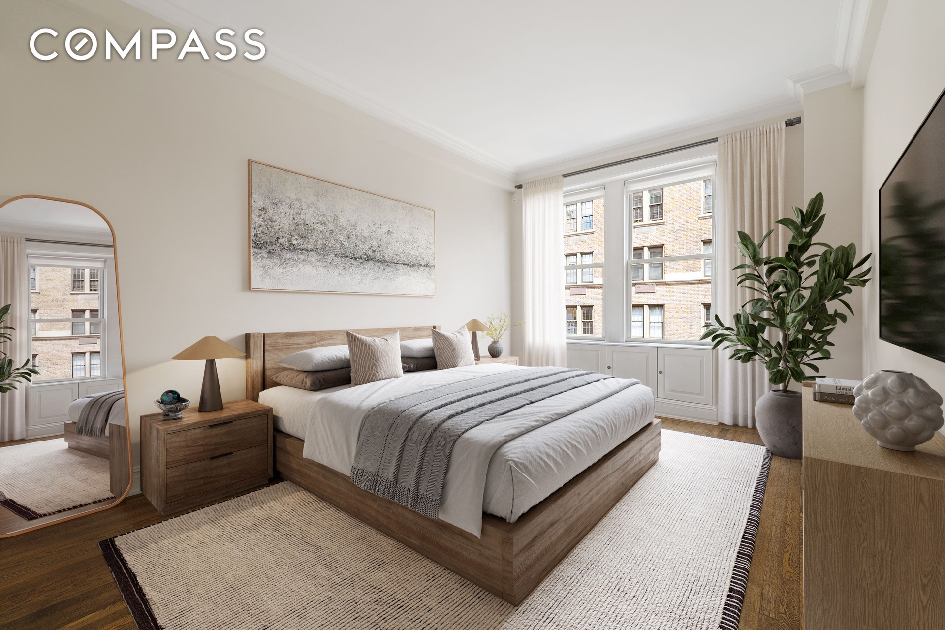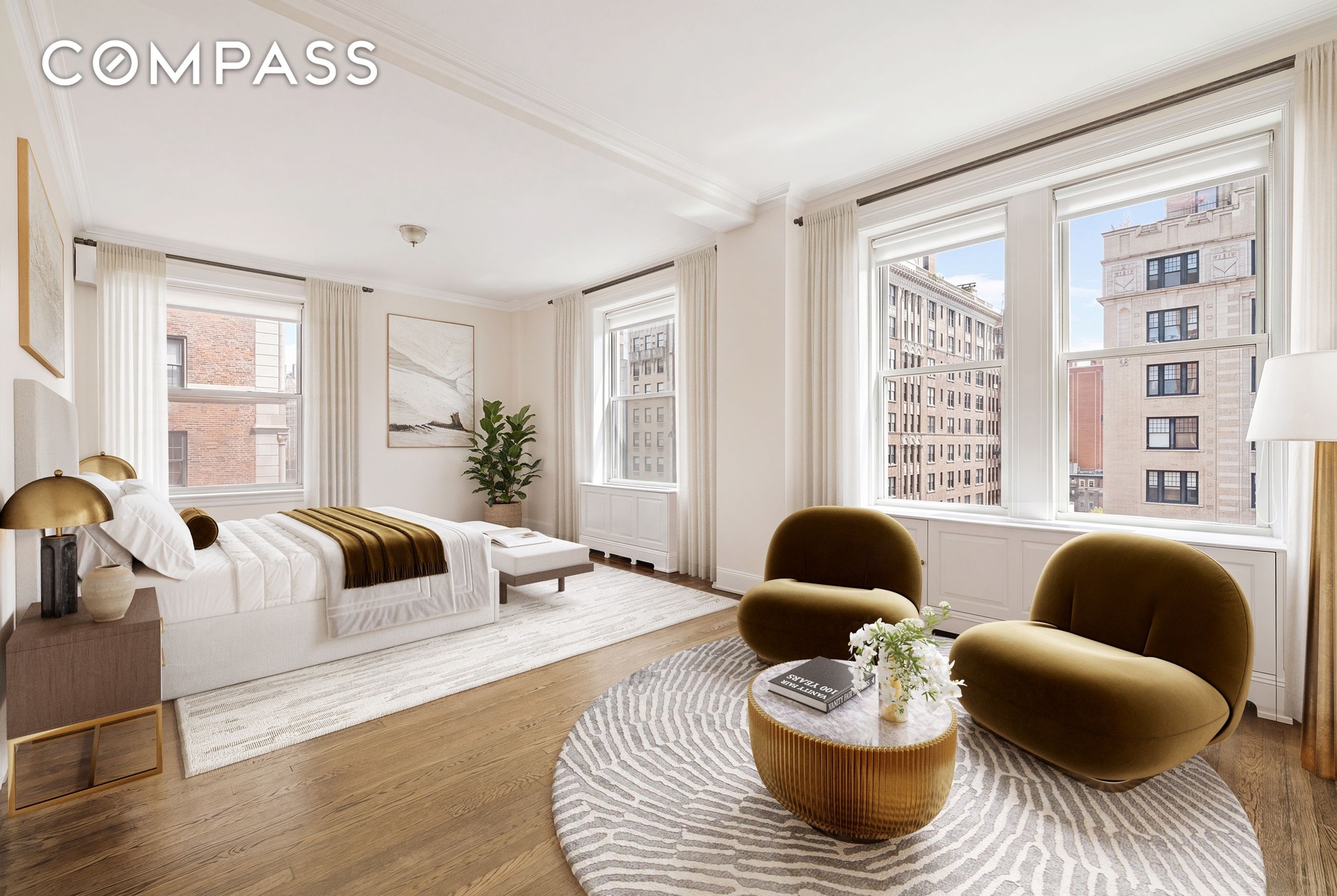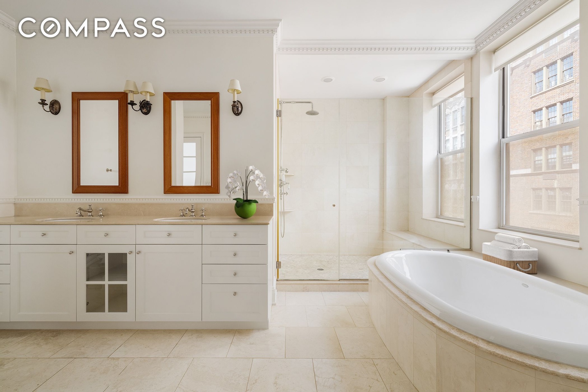 Originally configured as three bedrooms plus a library, the home now offers a palatial corner primary suite created by combining two bedrooms. This exceptional retreat boasts oversized windows overlooking Park Avenue, extraordinary custom designed closet space, and an expansive en-suite bathroom of rare scale for a prewar residence—complete with a double vanity, a large glass-enclosed shower, and a luxurious soaking tub. The second bedroom is generously proportioned and features its own beautifully appointed en-suite marble bathroom. An Alternative Floorplan is provided for those seeking an additional bedroom.