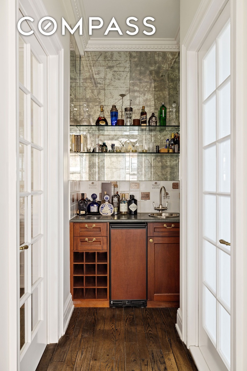 Handsome French doors lead to the gracious dining room, thoughtfully designed with recessed lighting and two large windows. Just beyond, there is a charming wet bar perfect for intimate gatherings as well as larger-scale entertaining. The adjacent corner library is bathed in sunlight and offers views of Central Park, and with an adjacent windowed full bathroom outfitted with Waterworks fixtures, this room can easily function as a third bedroom.