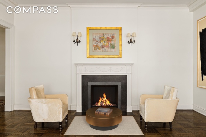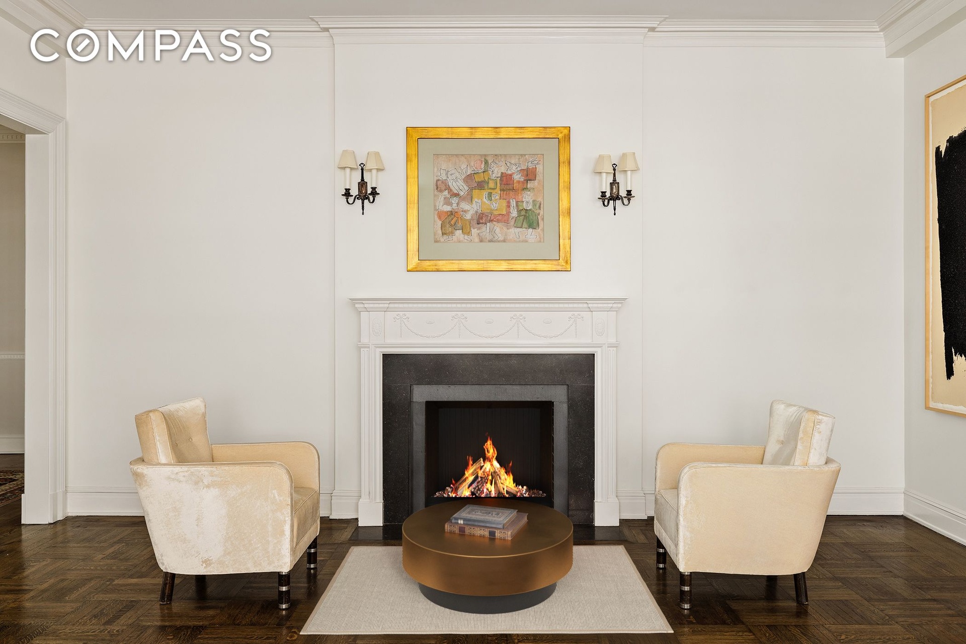 A semi-private elevator landing opens to an elegant foyer, leading into a grand entrance gallery. The stately living room exudes prewar grandeur, featuring soaring ceilings, a beautiful wood-burning fireplace, exquisite moldings, and two oversized north-facing windows.
