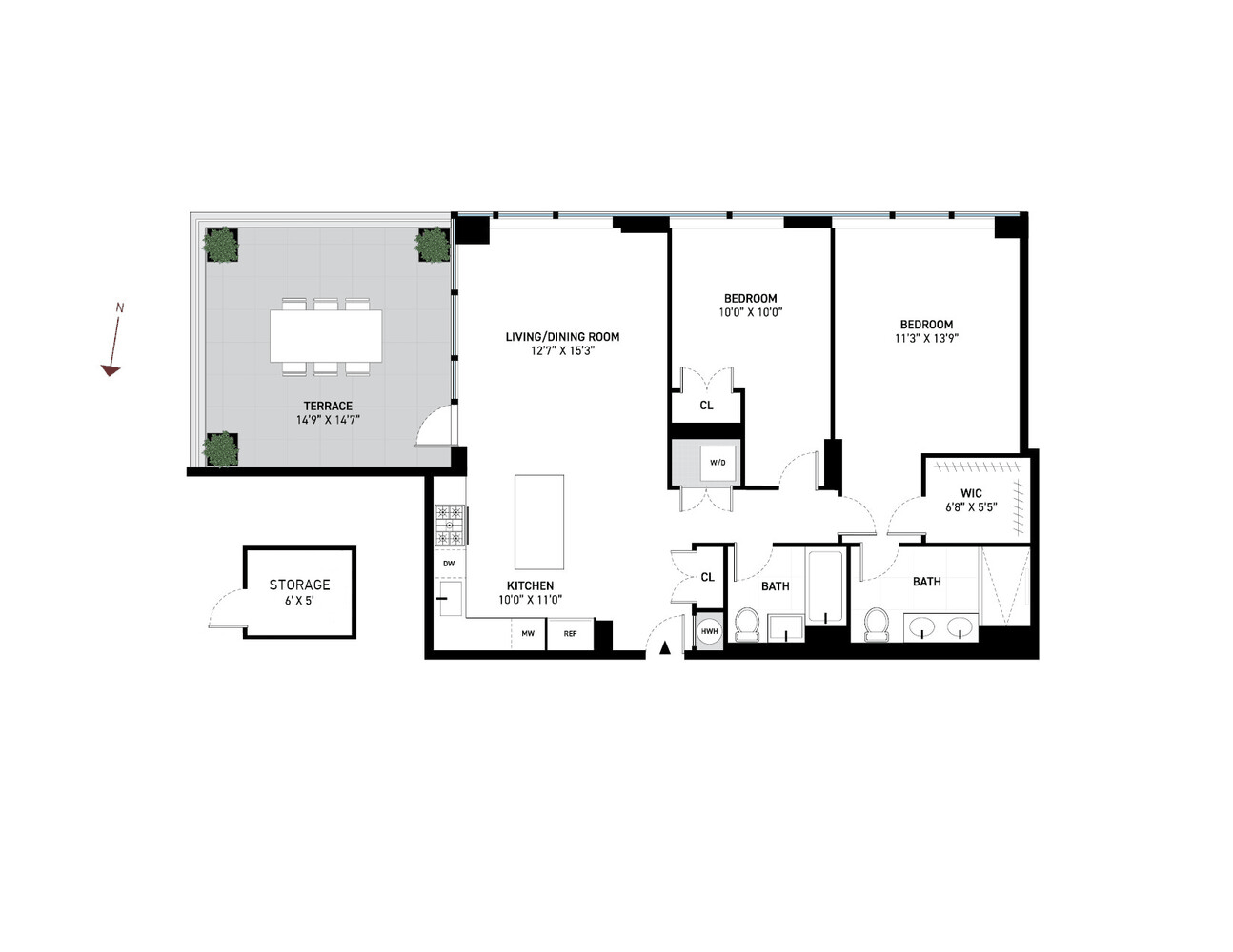 • 226 SF terrace with open sky views + water and power