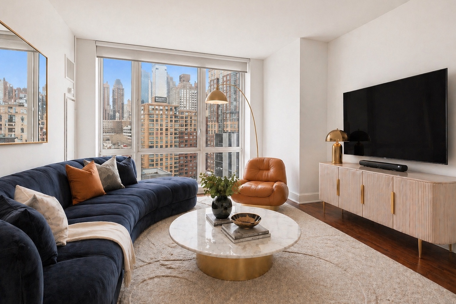 This elegant residence features oversized windows, rich Brazilian cherry wood floors, and a thoughtfully designed layout that maximizes light, flow, and function. The living and dining area is bright and inviting, with generous space for both entertaining and everyday living. Floor-to-ceiling windows frame open city views, while the stylish staging highlights the home’s modern proportions and warm, elevated feel.