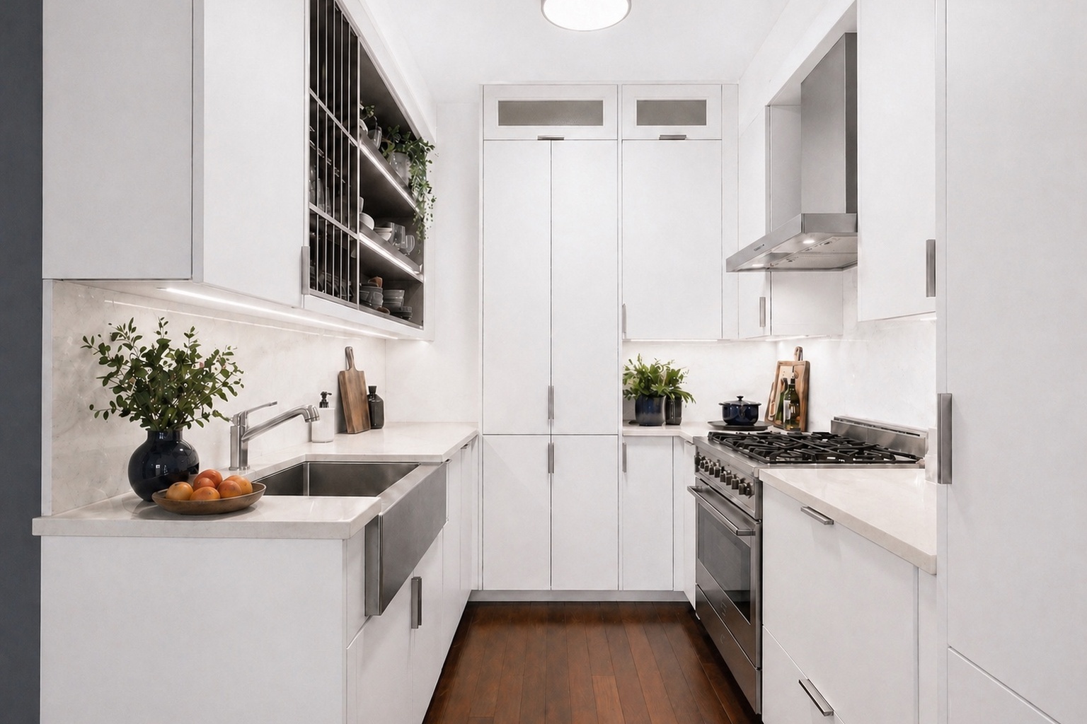 The open kitchen is both sleek and practical, featuring clean white cabinetry, stainless steel appliances, a gas range, and excellent storage. Positioned just off the dining area, it creates an easy connection between cooking, hosting, and relaxing.