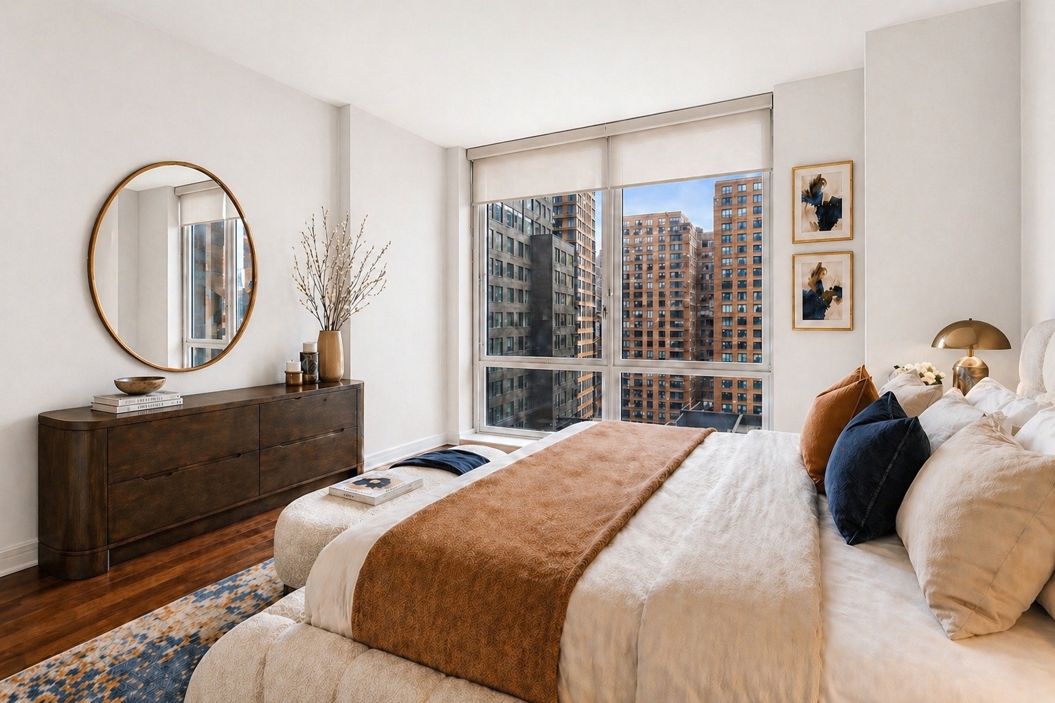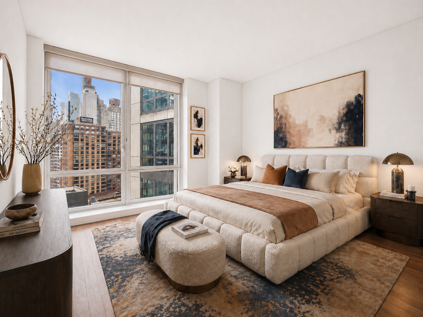 The bedroom offers a calm, luxurious retreat with large windows, beautiful natural light, and enough space for a king-size bed, nightstands, and additional furnishings. Warm tones, layered textures, and elegant finishes create a peaceful atmosphere that feels polished without trying too hard, which is apparently rare enough to deserve applause.