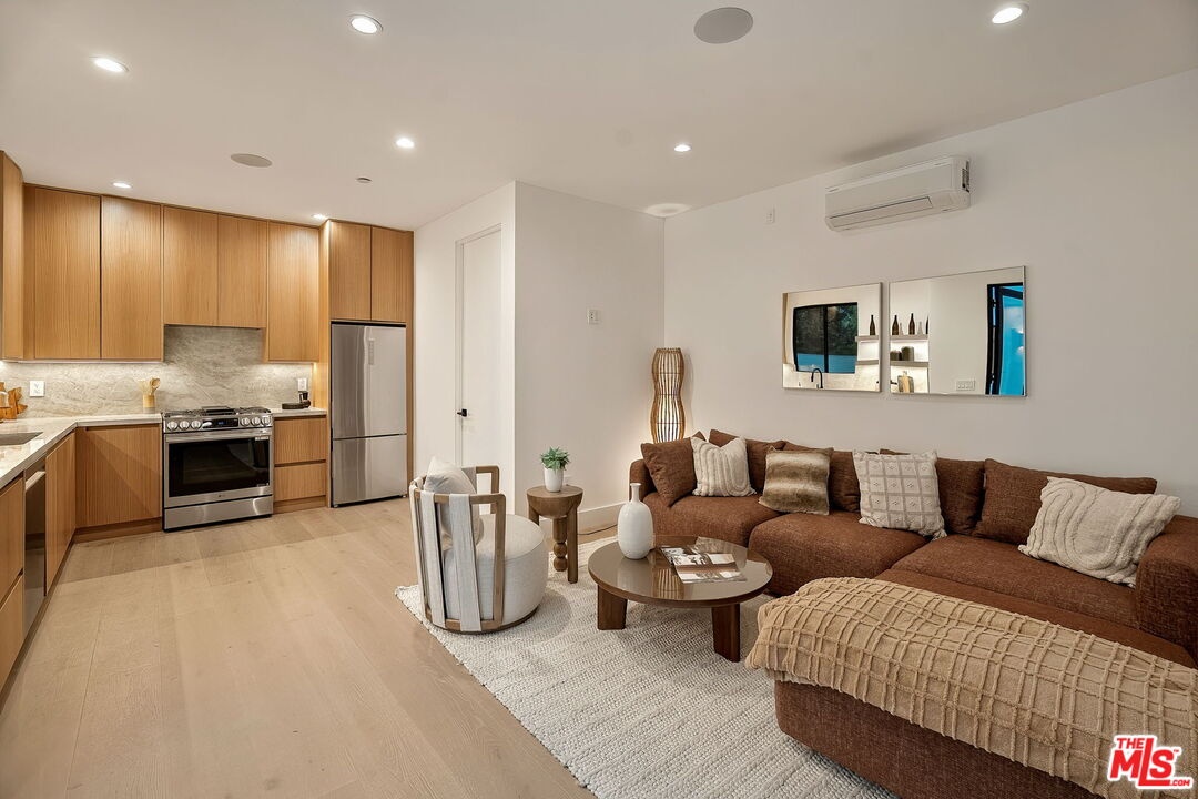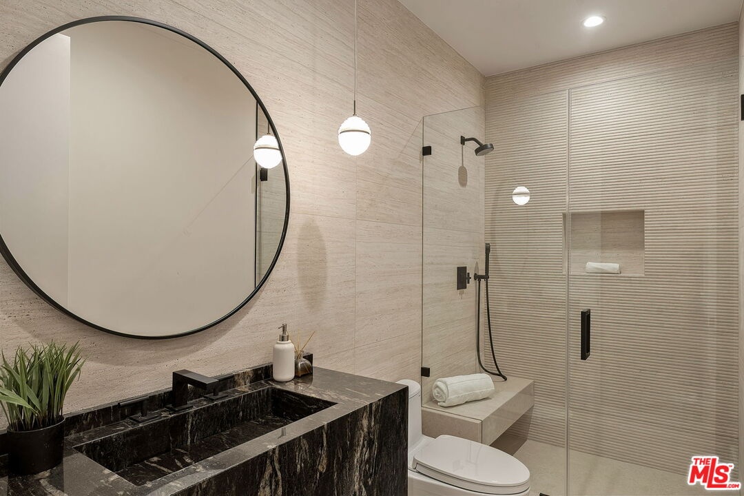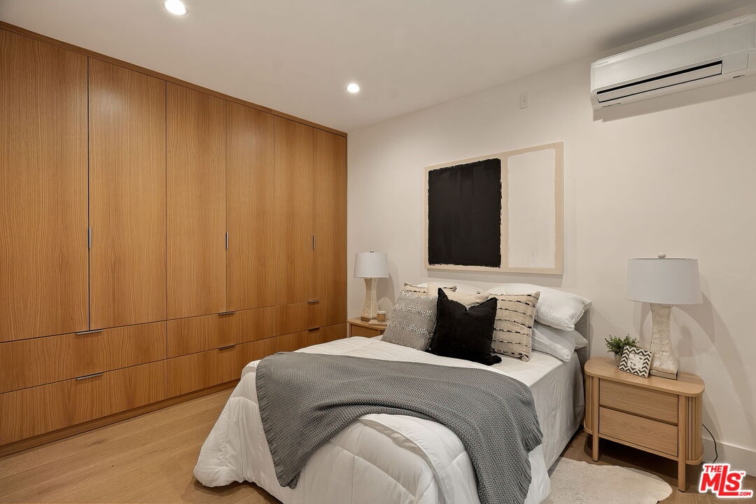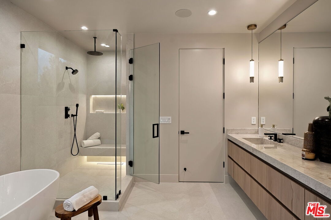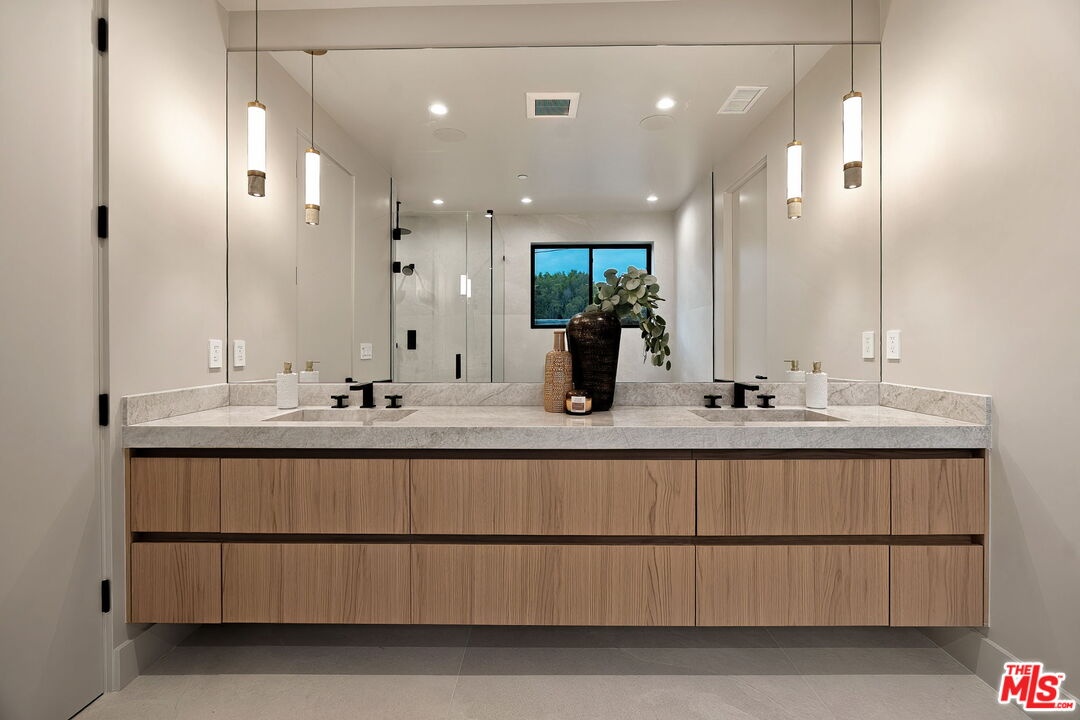 A striking fusion of contemporary design and natural elements, this newly built organic modern farmhouse offers an unparalleled living experience. Designed with seamless indoor-outdoor flow, the open-concept layout is bathed in natural light, boasting soaring ceilings and meticulous craftsmanship throughout. This fully automated smart home showcases exquisite European white oak flooring, custom rift white oak cabinetry, and hand-selected marble and tile, complemented by premium fixtures. The heart of the home is a chef's dream kitchen, featuring sleek custom-paneled Thermador appliances, an oversized waterfall island with Taj Mahal quartzite, and seamless integration with the spacious dining and living areas. A dramatic floating staircase adds architectural interest, while expansive glass doors open to a private entertainers paradise complete with a built-in BBQ island, lush green space, and ample room for gatherings. Upstairs, the serene primary suite is a true retreat, offering a cozy fireplace, a spa-inspired bathroom with a soaking tub, rain shower, dual vanity, and a generous walk-in closet. A private balcony overlooks the beautifully landscaped backyard, adding to the tranquil ambiance. Two additional en-suite bedrooms provide comfort and sophistication. Adding to the homes versatility, a separate 1-bedroom, 1-bathroom ADU with a full kitchen offers endless possibilities, ideal for guests, or a private office. Located in the highly coveted Mar Vista wood streets neighborhood, this rare gem offers an exceptional blend of style, comfort, and functionality.