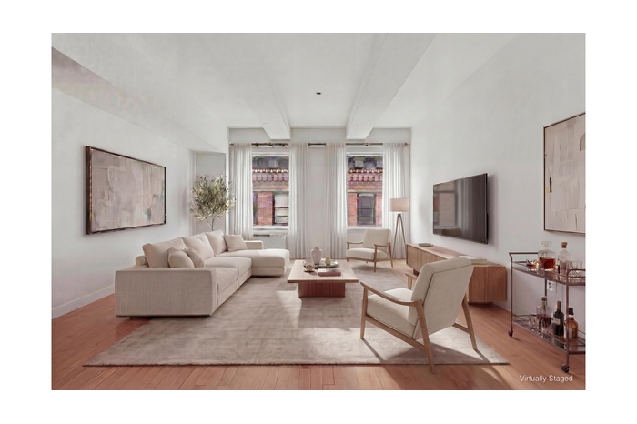 The thoughtfully designed kitchen features a clean, modern aesthetic, seamlessly integrated into the main living space, while the bathrooms reflect a refined, minimalist approach. Originally envisioned by Philippe Starck, the residence showcases distinctive design elements throughout. A defining feature of the home is its impressive sense of scale, accentuated by approximately 11-foot beamed ceilings and expansive living and entertaining areas. Additional features include a dedicated laundry closet with in-unit washer and dryer and refined architectural detailing throughout.