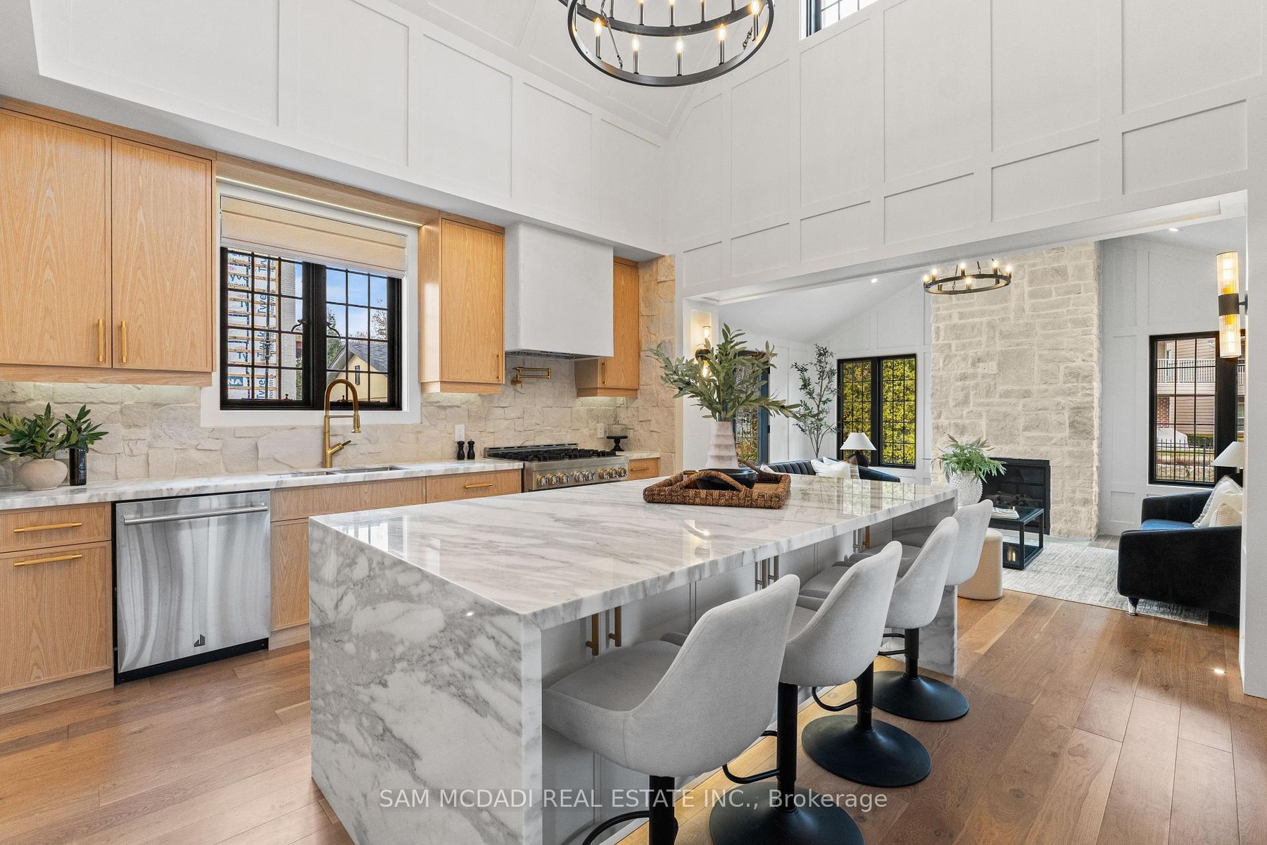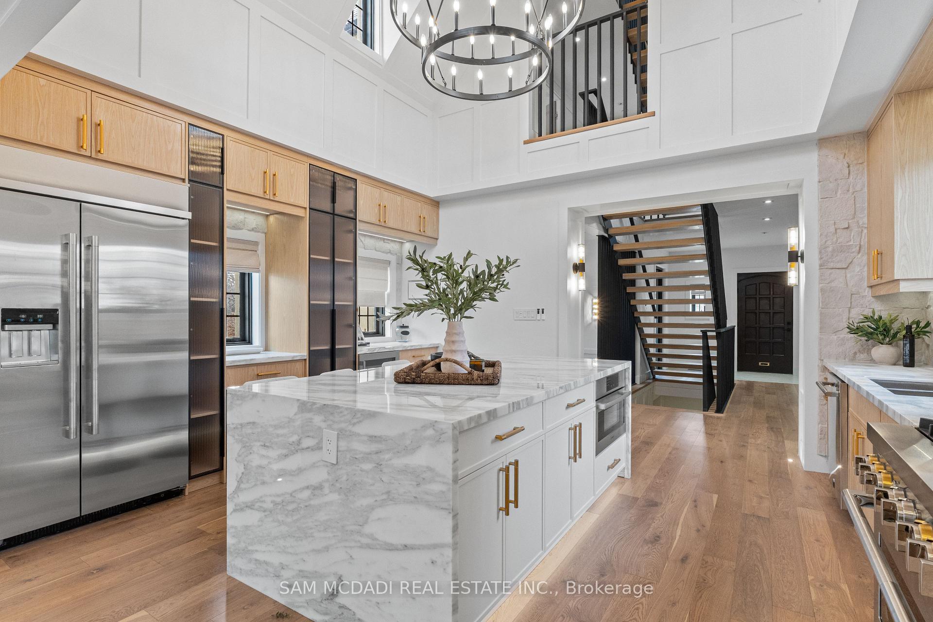 Welcome to the famous George Unsworth home, a high quality Neo-Tudor style home constructed with cut & carved stone alongside a textured stucco exterior finish. Redesigned by renowned architect Walter Scott, and located in Aldershot's upscale neighbourhood, this beautiful home w/ approximately 5,000 SF total has been completely reimagined w/ a modern yet charming design. Upon entering, you'll find large principal rooms enhanced with sophisticated hardwood floors, LED pot lights, panelled walls, and more. At the heart of this home is where you'll locate the chef's kitchen elevated w/ a centre island, stone countertops, JennAir appliances, charming stone backsplash and ample cabinetry space. Overlooking the kitchen is the grand family room, which boasts cathedral ceilings, a stone fireplace, and direct access to your covered outdoor patio, perfect for al-fresco dining with loved ones. Also on this level is the formal living room, which features a fireplace, wood beam ceilings, and access to the outdoor patio, as well as a home office perfect for professionals working from home. Ascend to the owner's suite, curated with a boutique inspired walk-in closet, a wet-bar, and an oversized 6-pc ensuite w/ heated floors, a soaker tub, and a rainfall shower. 2 more bedrooms with built-in closets and a shared 3-pc bath with heated floors are down the hall. The loft can easily serve as a nanny or in-law suite, featuring a spacious bedroom w/ a 3-pc ensuite, a seating area, and a separate laundry room. The basement completes this home with perfect entertainment spaces incl: a wet bar, a large recreation room, a 5th bedroom, a 3-pc bath w/ heated floors, and a den that can serve as a gym, play room, spa, or theatre - the possibilities are endless. Beautifully situated in a highly rated family oriented neighbourhood nearby top rated schools, grocery stores, shopping malls, lakeside parks and trails & more. A piece of history with a modern twist!
