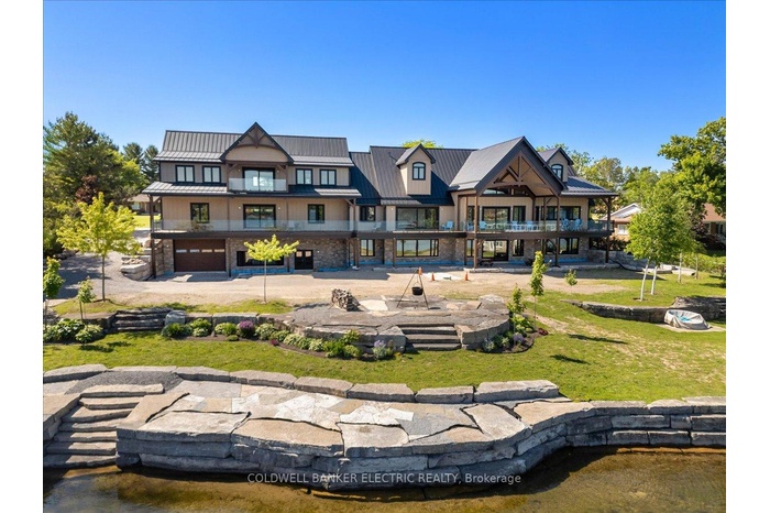 Introducing a rare waterfront estate of remarkable scale and presence. Set on a prized double lot with over 200 feet of armoured stone shoreline, this is a property designed not just to impress - but to endure. Crafted for multi-generational living, the residence offers more than 9,500 square feet of refined interiors, where space, light, and craftsmanship converge effortlessly. Five bedrooms plus office/den and six beautifully appointed bathrooms unfold across a layout that is both expansive and intimate, crowned by a private penthouse suite that feels entirely its own. At the heart of the home, a grand great room rises beneath a soaring cathedral ceiling, where exposed beams and ambient lighting create a sense of quiet drama. The kitchen is equally striking - designed for both everyday living and elevated entertaining - with quartz surfaces, a herringbone backsplash, dual islands, a walk-in pantry, and a full suite of premium appliances. Seamless transitions lead outdoors to an expansive waterfront deck, thoughtfully designed with covered and open-air spaces for gathering, dining, or simply taking in the uninterrupted lake views. The amenities are as impressive as they are rare: heated upper and lower garages with capacity for up to twelve vehicles, and a beautifully crafted stone boathouse complete with marine rail and rooftop deck - an exceptional vantage point over the water. As day turns to evening, the shoreline transforms into a private retreat, anchored by a firepit and the quiet rhythm of the lake. A property of this scale and caliber is seldom offered. Within the Kawartha Lakes, it stands in a class of its own!