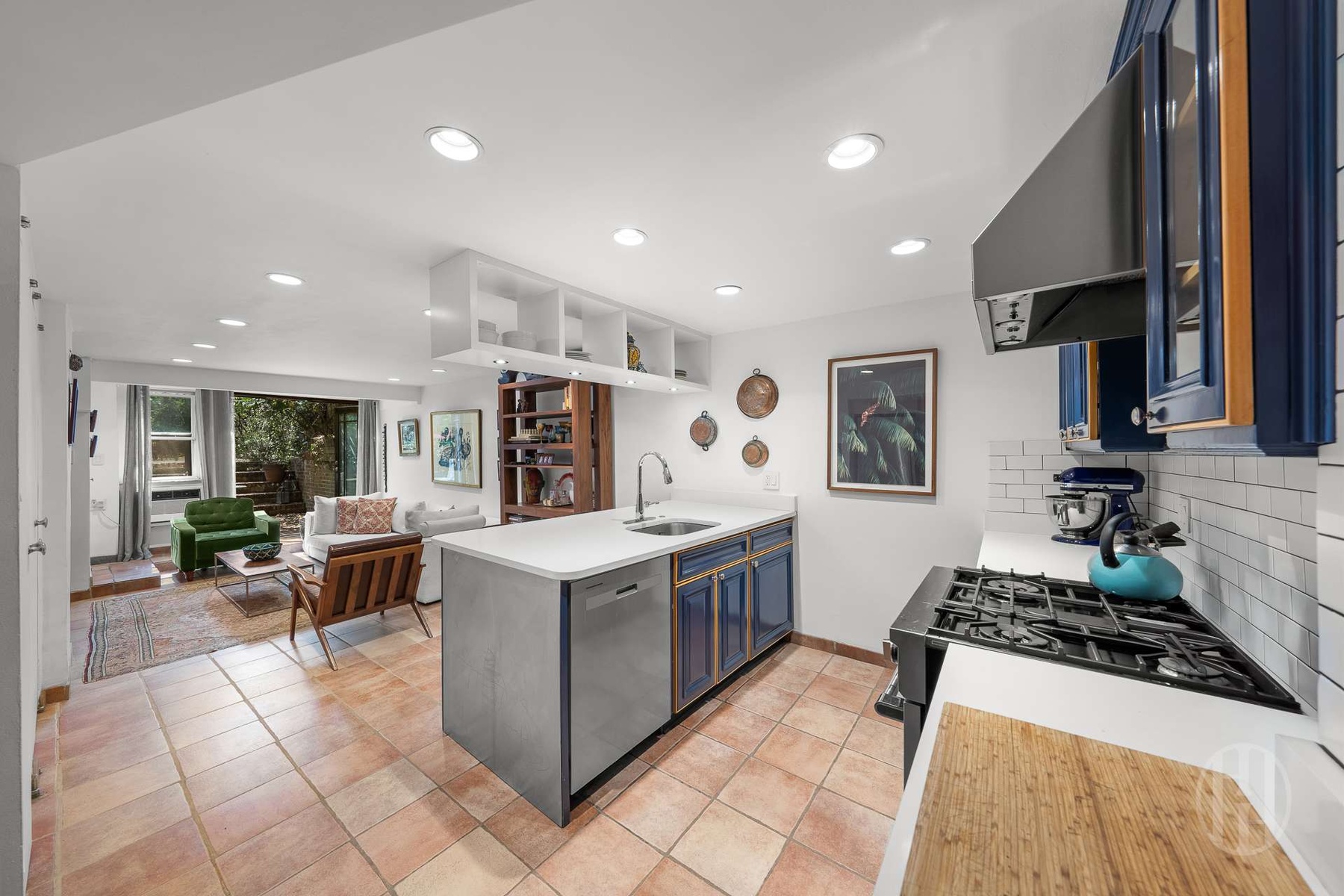 On the lower level, a generous open kitchen flows into the living space and out to a lush private garden, creating a seamless connection between indoors and out.