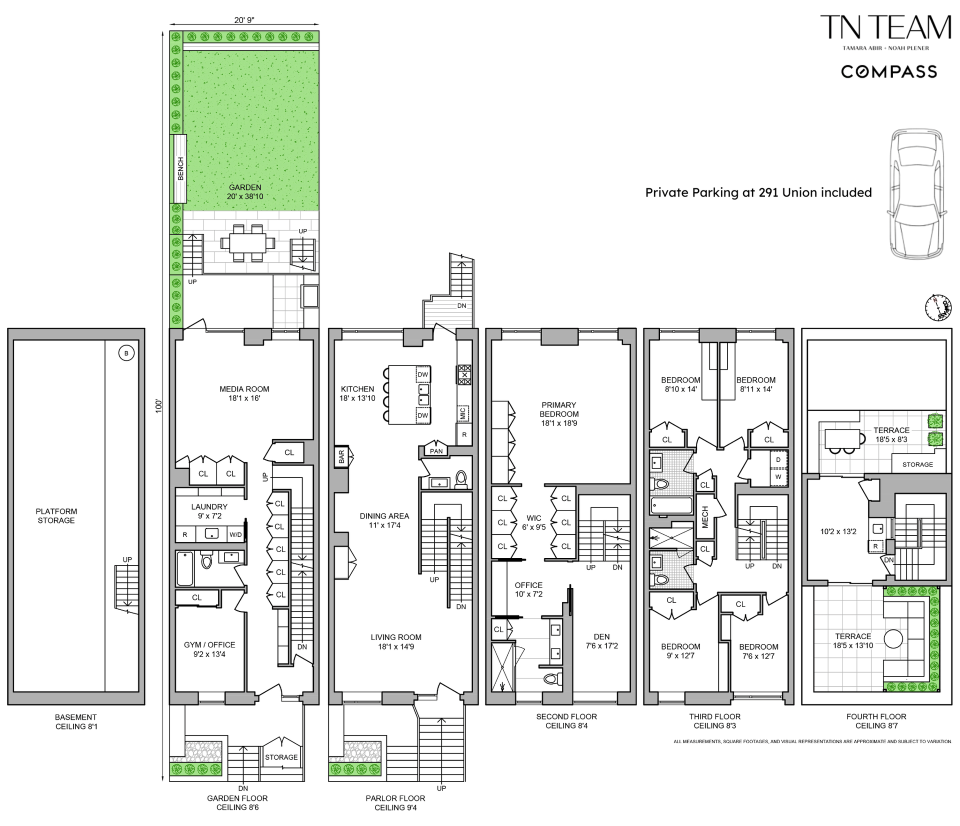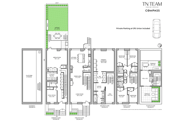 Welcome to 283 Union Street. A modern, meticulously-renovated single-family townhouse, with multiple outdoor spaces, incredible light and the ultimate convenience in brownstone Brooklyn - private parking. Every inch of this nearly 4000 SF home has been thoughtfully crafted for both functionality and design. The fantastic layout offers 6 bedrooms and 4.5 baths over 5-levels with amazing indoor-outdoor flow to the backyard and roof terraces.