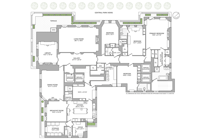 All the principal rooms open onto surrounding terraces, and french doors throughout invite indoor-outdoor living. Rare glass terrace parapets allow the apartment's sweeping views of the Park to be felt in every room. Accessed via a private elevator landing, the grand Gallery opens to three spectacular entertainment rooms: a marvelous west-facing Living Room, nearly 30 feet in length, with three sets of tall French casement doors opening to the Terrace; an exquisite south-facing wood-paneled Library; and a handsome south-facing Dining Room. The Living Room and Library have wood-burning fireplaces, and all three rooms are perfect in proportion and scale. Nearby, ample closets and an elegant Powder Room complete the grand and welcoming sweep of the entertainment rooms.