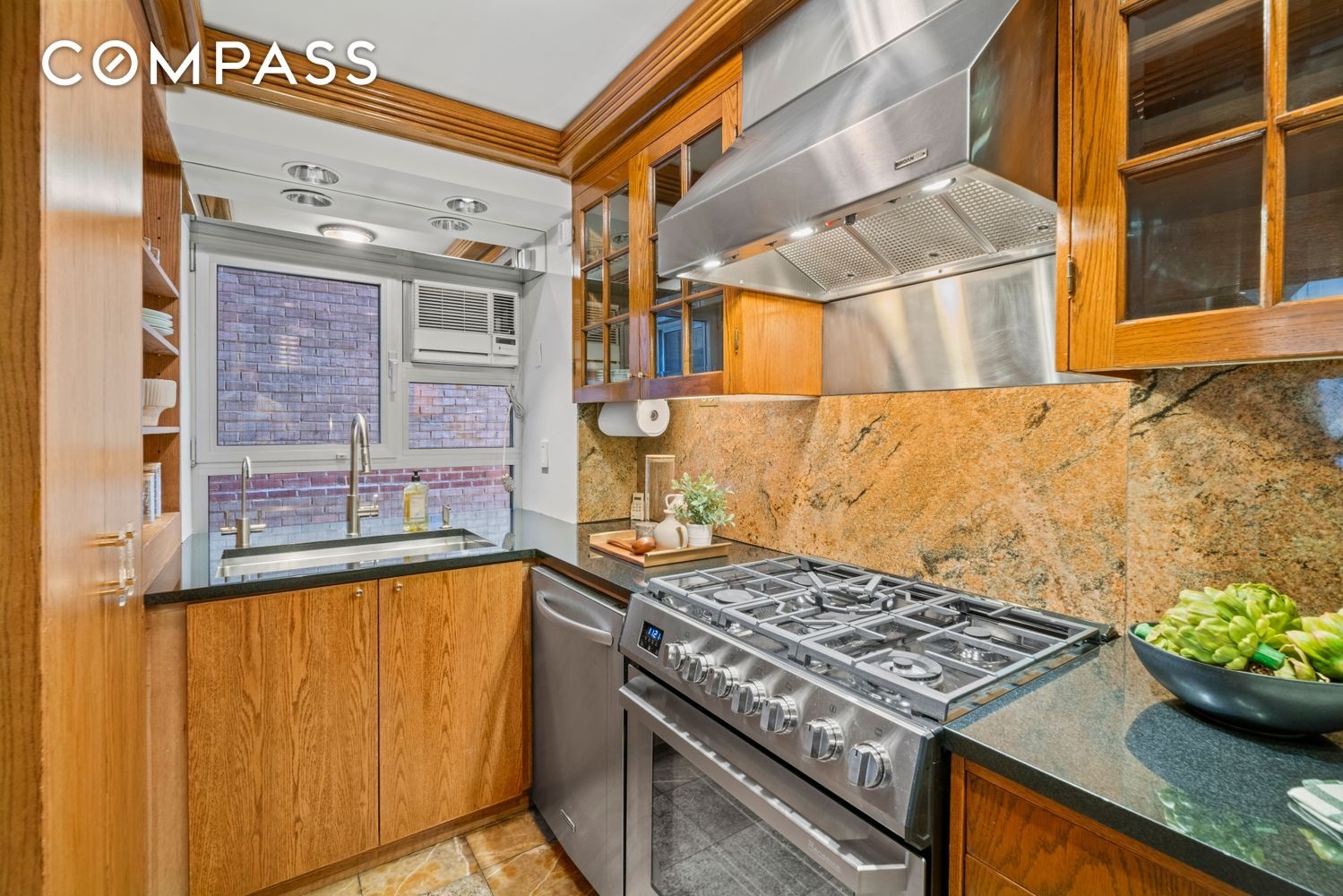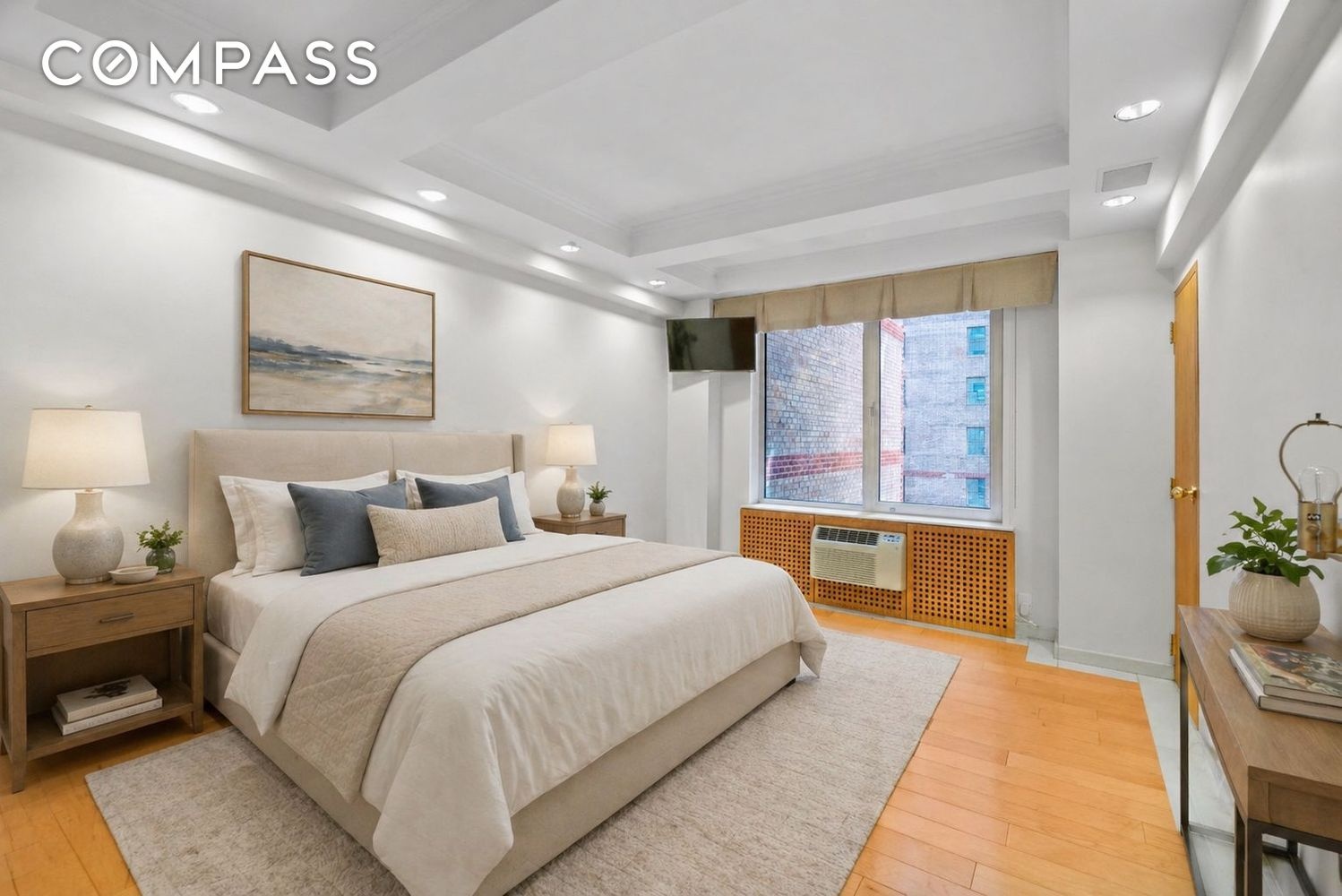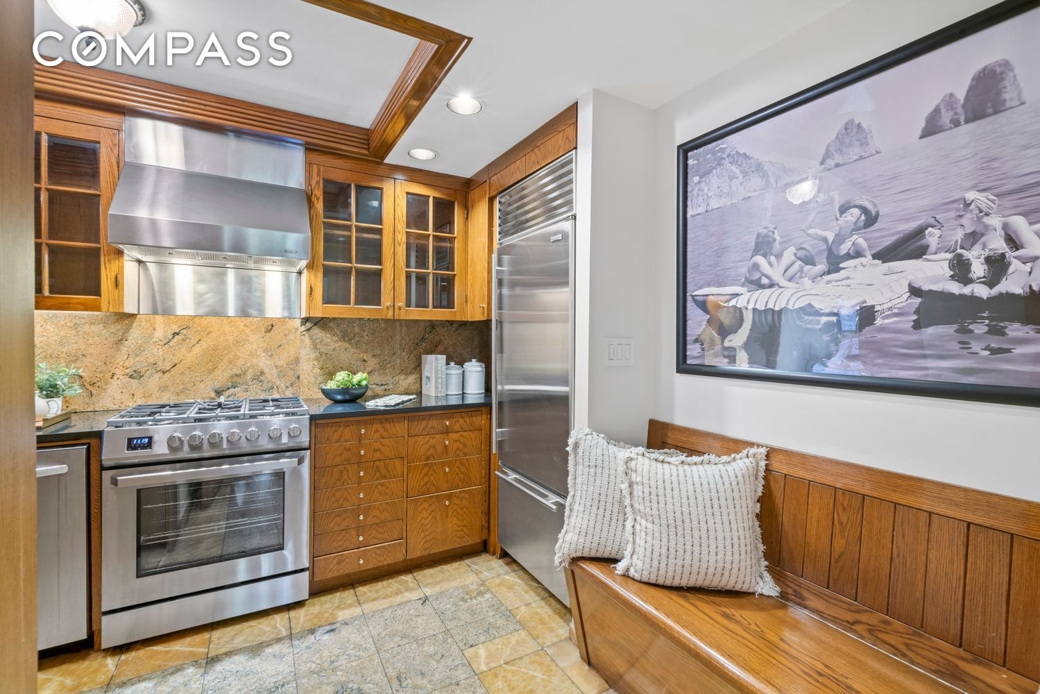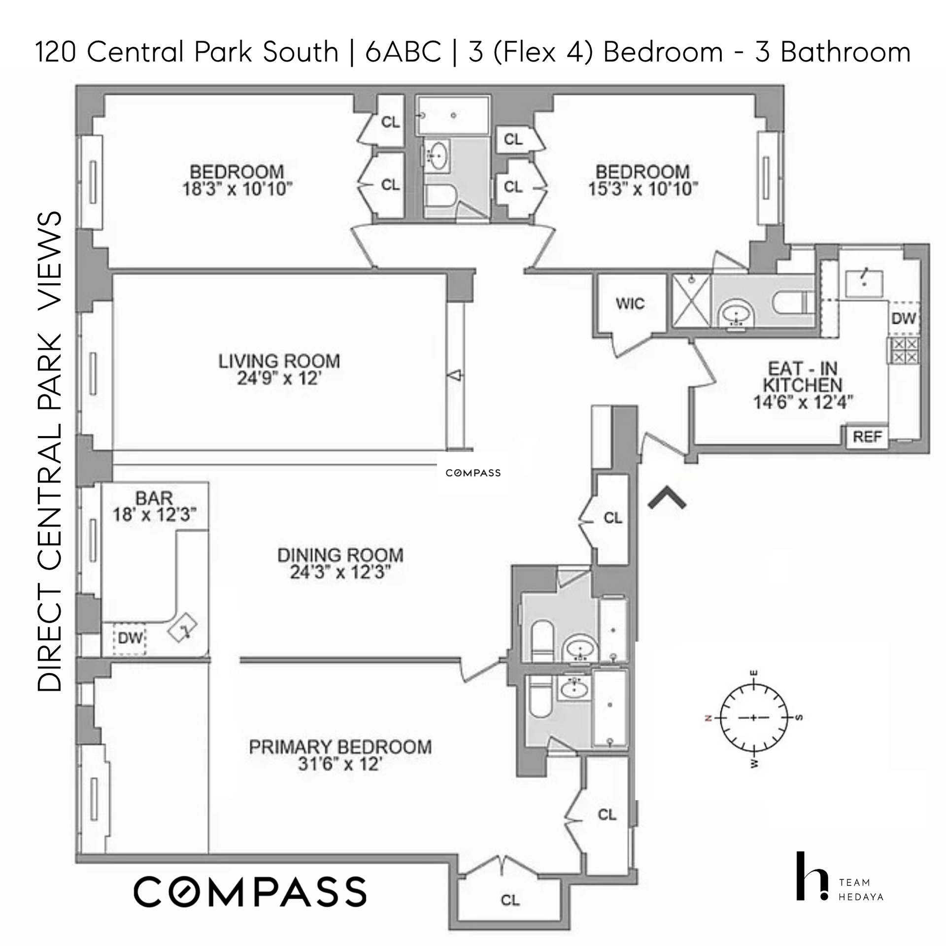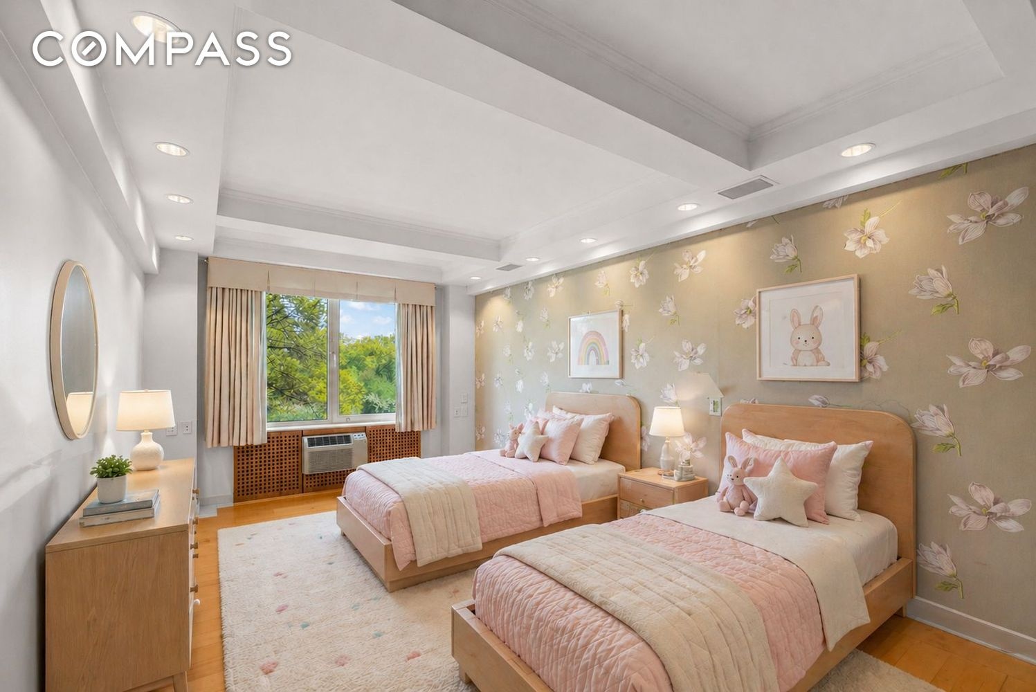 Unit 6AB is a three-bedroom, three-bathroom residence spanning approximately 1,650 square feet, with 35 feet of direct park frontage. The living and dining areas are broad and well-proportioned, with large picture windows framing the park through every season. The primary suite has its own park-facing sitting area. The two additional bedrooms are generous and flexible — family, guests, a home office, or a studio. The windowed eat-in kitchen offers ample space for both cooking and casual dining. Northern and southern exposures ensure natural light throughout the day.