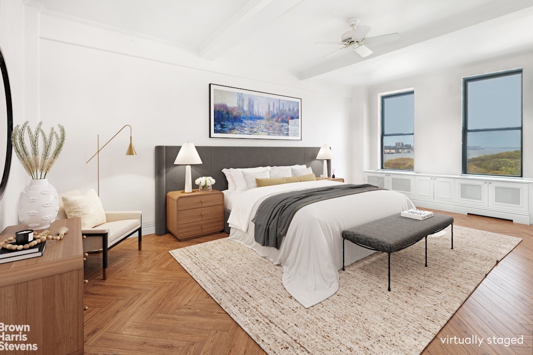 The stunning corner living room occupies the northeast corner of the home, with a picture-scale, double window framing Riverside Park, the Hudson River, and a direct sightline to the GW Bridge- all bathed in glorious light.