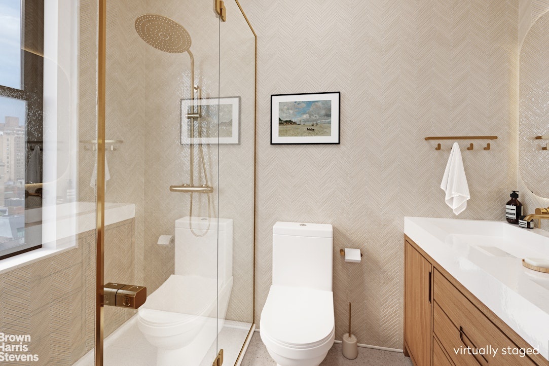 The primary bedroom is a serene and oversized retreat in the northwest corner with direct river views, a windowed en-suite bath, walk-in closet, and additional standard closet- exceptional storage by any measure. The second bedroom is equally generous, with elegant wood built-ins and its own windowed en-suite bath.
