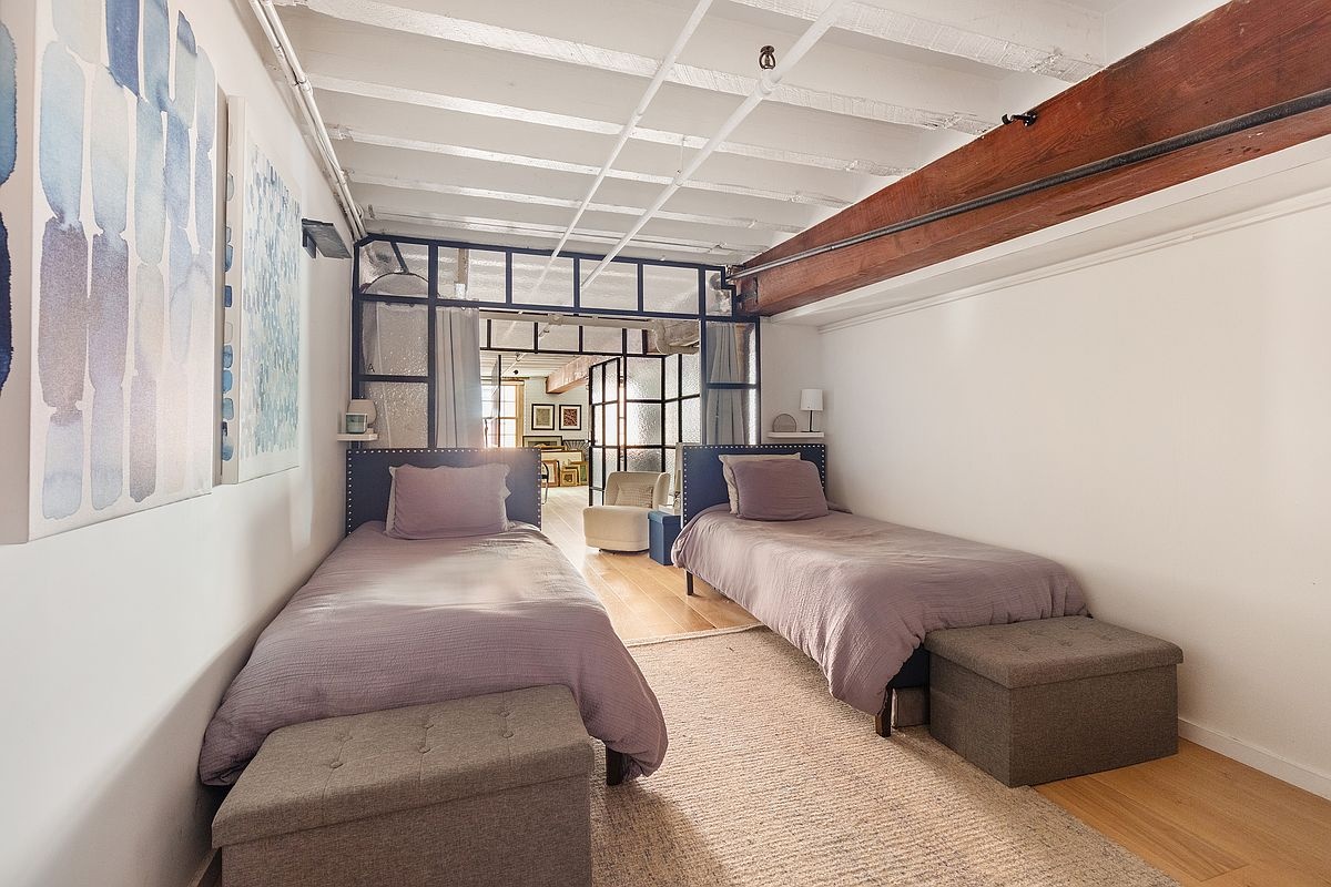 Set on a charming cobblestone block in the heart of Manhattan’s historic South Street Seaport, this exceptional full-floor loft blends authentic downtown character with a meticulous modern renovation. Spanning 1,818 square feet (as per OLR measurements,) the residence offers expansive open living with the flexibility to accommodate two sleeping areas (This property is legally a loft with two full bathrooms and is currently configured with one private and one open bedroom), a home office, and distinct living and dining spaces. A private elevator opens directly into the loft, where original wood-beamed ceilings, exposed brick walls, artisan millwork, and wide plank hardwood floors create a warm and sophisticated atmosphere. A custom steel-and-glass partition introduces an elegant entry sequence while preserving the loft’s open scale and natural light. The thoughtfully redesigned chef’s kitchen is appointed with premium Miele and Liebherr appliances and refined finishes, seamlessly connecting to the entertaining space. The home features two beautifully renovated full bathrooms, central A/C, washer/dryer as well as a generous walk-in closet and additional basement storage. Located in a boutique cooperative that functions with the ease of a condominium - no flip tax, and unlimited subletting permitted — a rare combination in downtown Manhattan. Just outside your door, enjoy the Seaport’s vibrant waterfront lifestyle, with acclaimed restaurants - Mark Joseph Steakhouse and Osteria del Porto - boutique shopping, the East River Esplanade, weekend greenmarkets, and effortless access to multiple subway lines at the newly renovated Fulton Station.