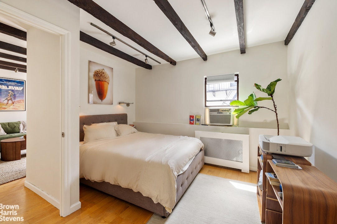 With nine total windows, including north and south exposures plus three skylights throughout, the light is constant. Original exposed beams add character, while the layout is sensible. The walk-in closet is oversized and rare, made even better with its own skylight. A built-in breakfast bar adds flexibility, and the vaulted ceilings stretch over 11 feet. The bathroom is generously sized and nicely renovated, featuring a deep soaking tub. The entire apartment has been thoughtfully updated throughout.