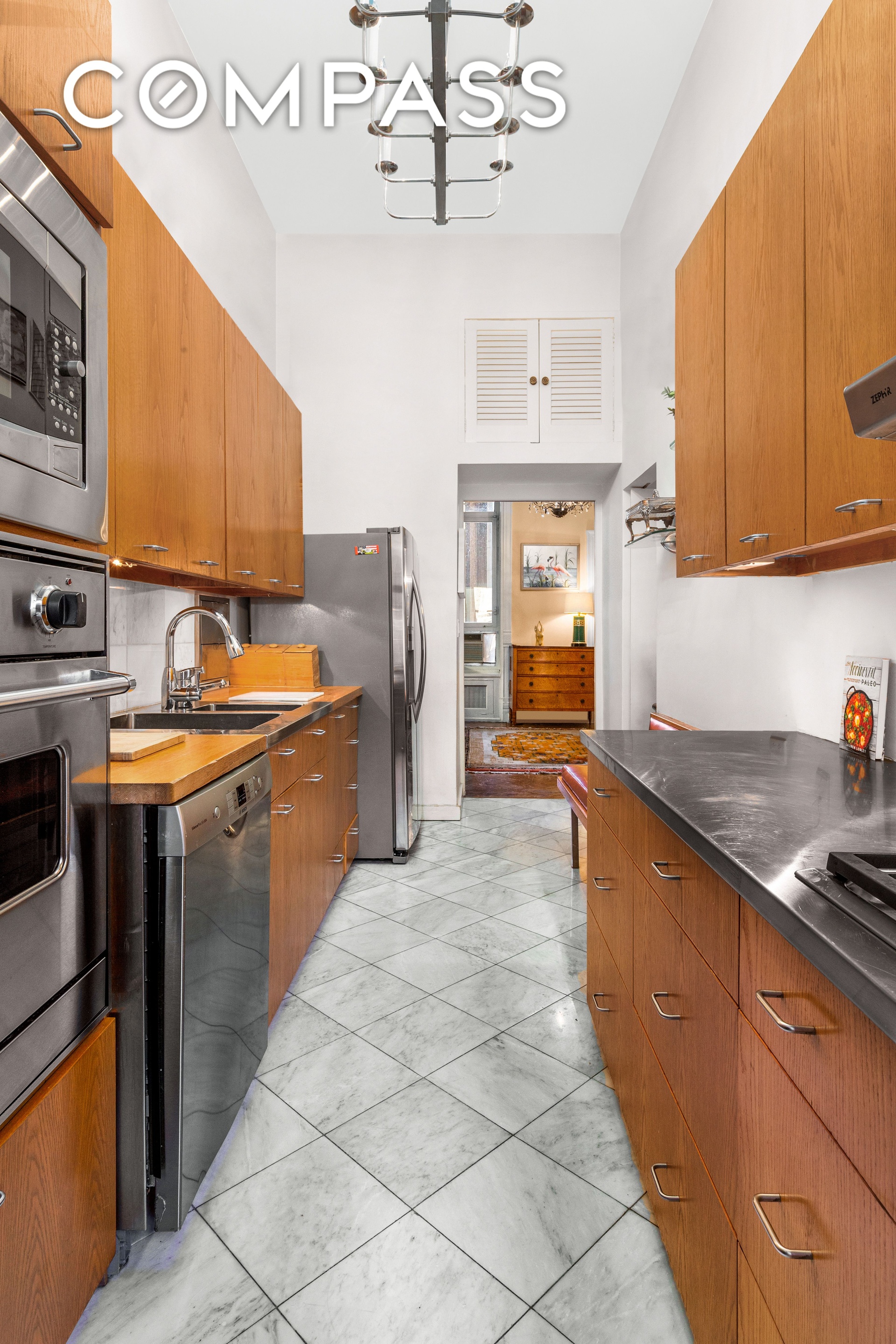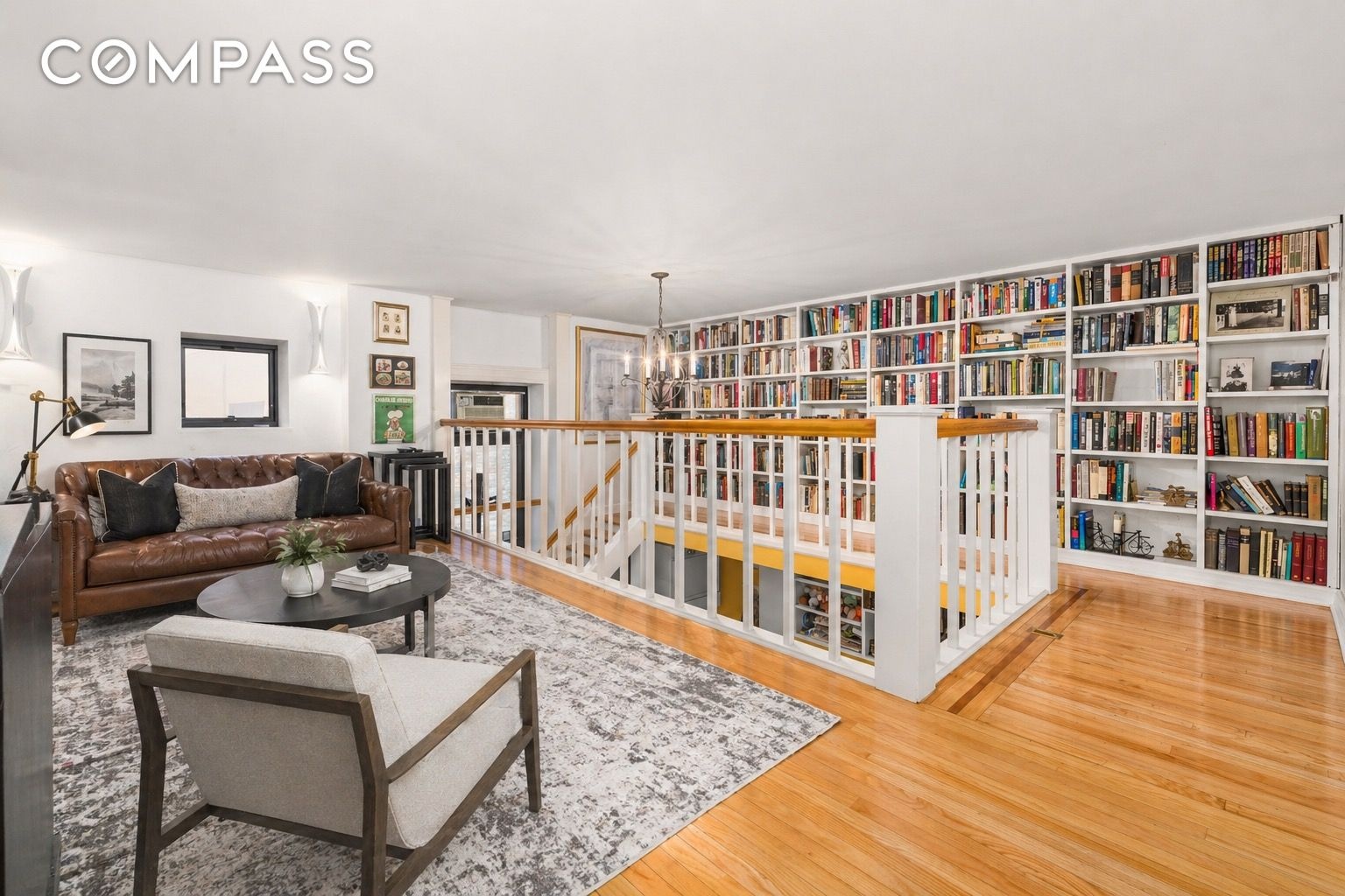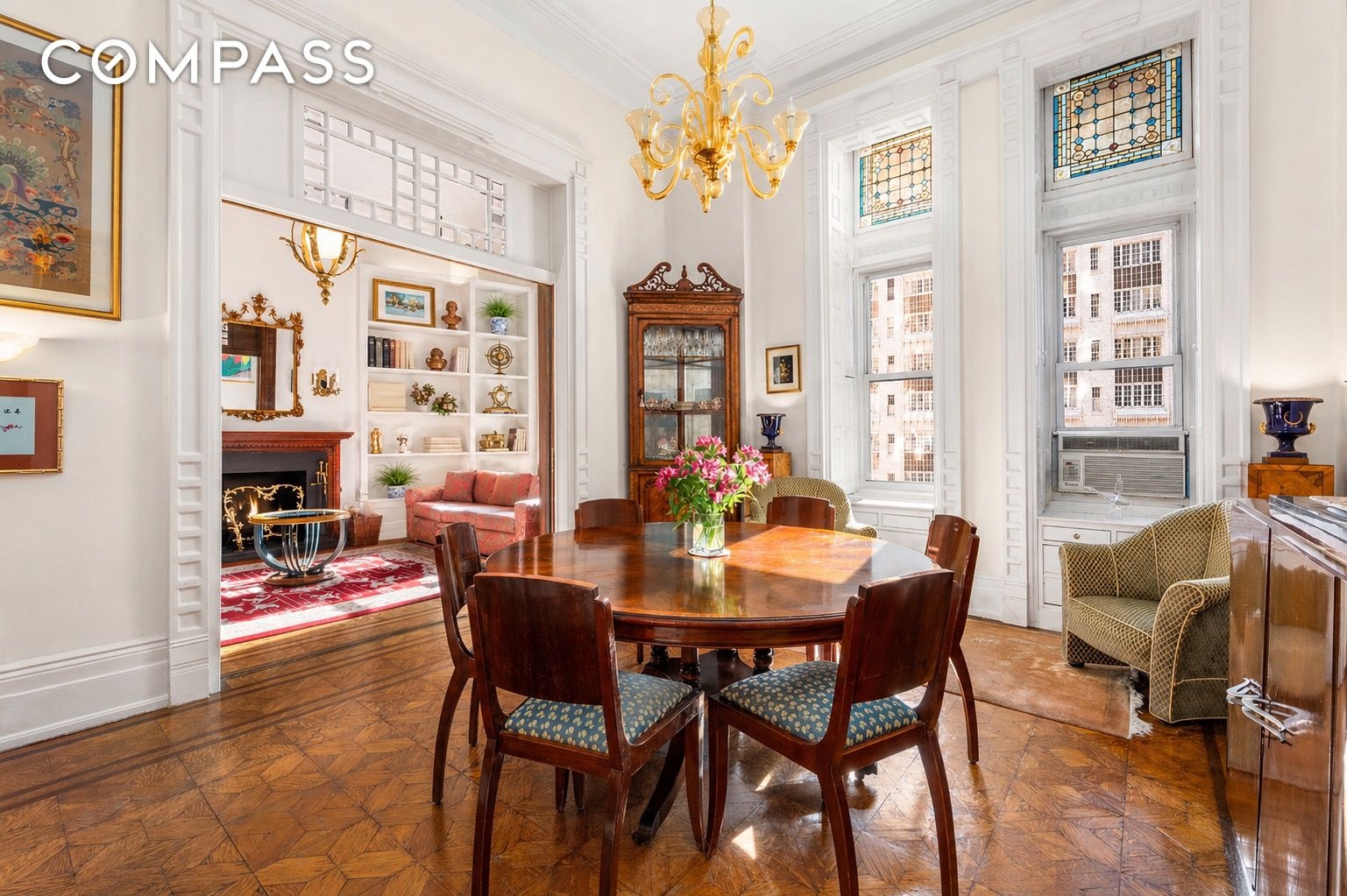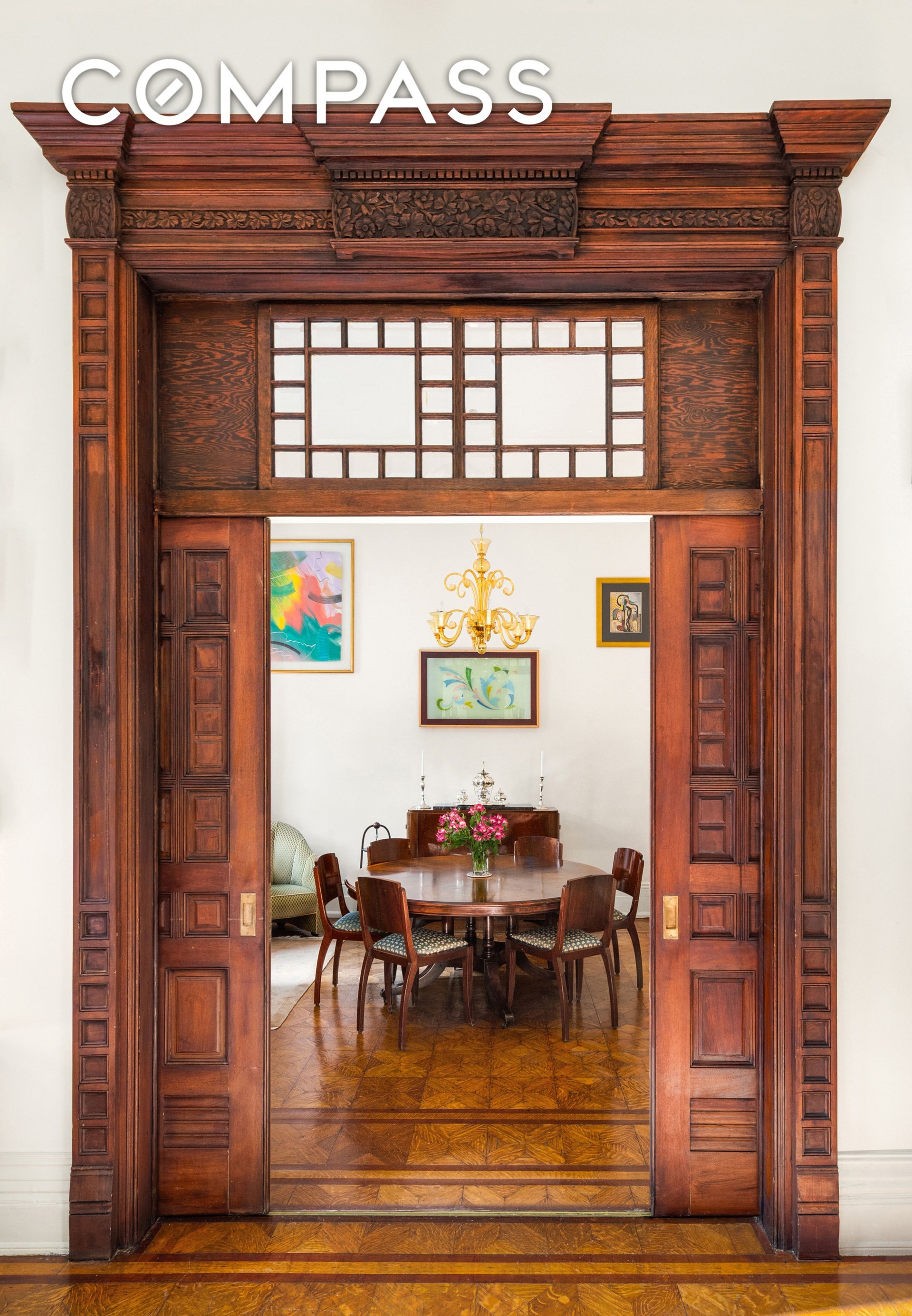 Ahead you will discover the sun-filled living room that overlooks 57th Street through oversized windows adorned with geometric carvings and original Tiffany stained glass.