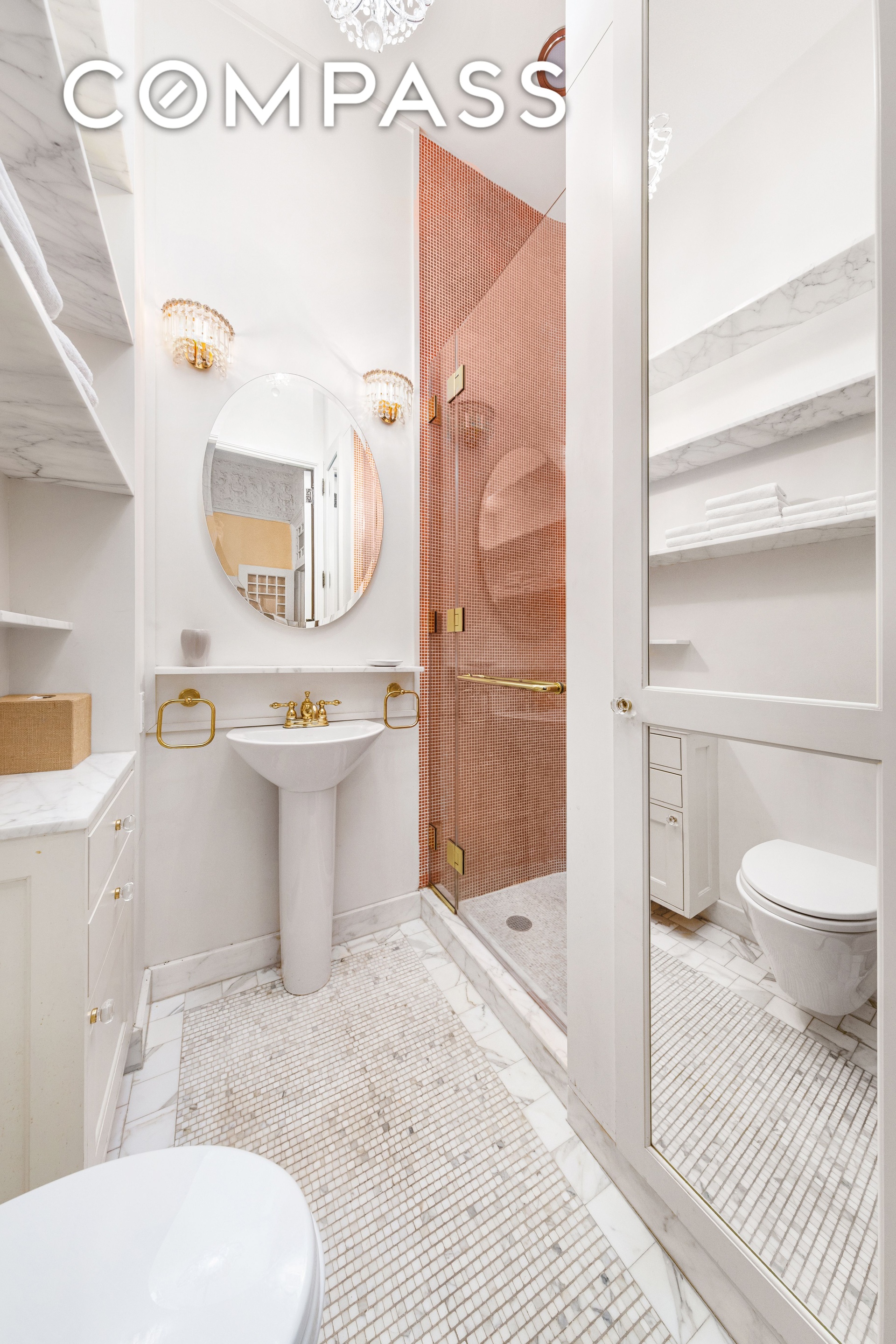 The well-proportioned second bedroom is enhanced by plaster frieze moldings along the perimeter of the ceiling, and a wine bar. The renovated ensuite bathroom is appointed with white marble countertop and floors, a standing shower with mosaic tiles, and a Toto toilet.