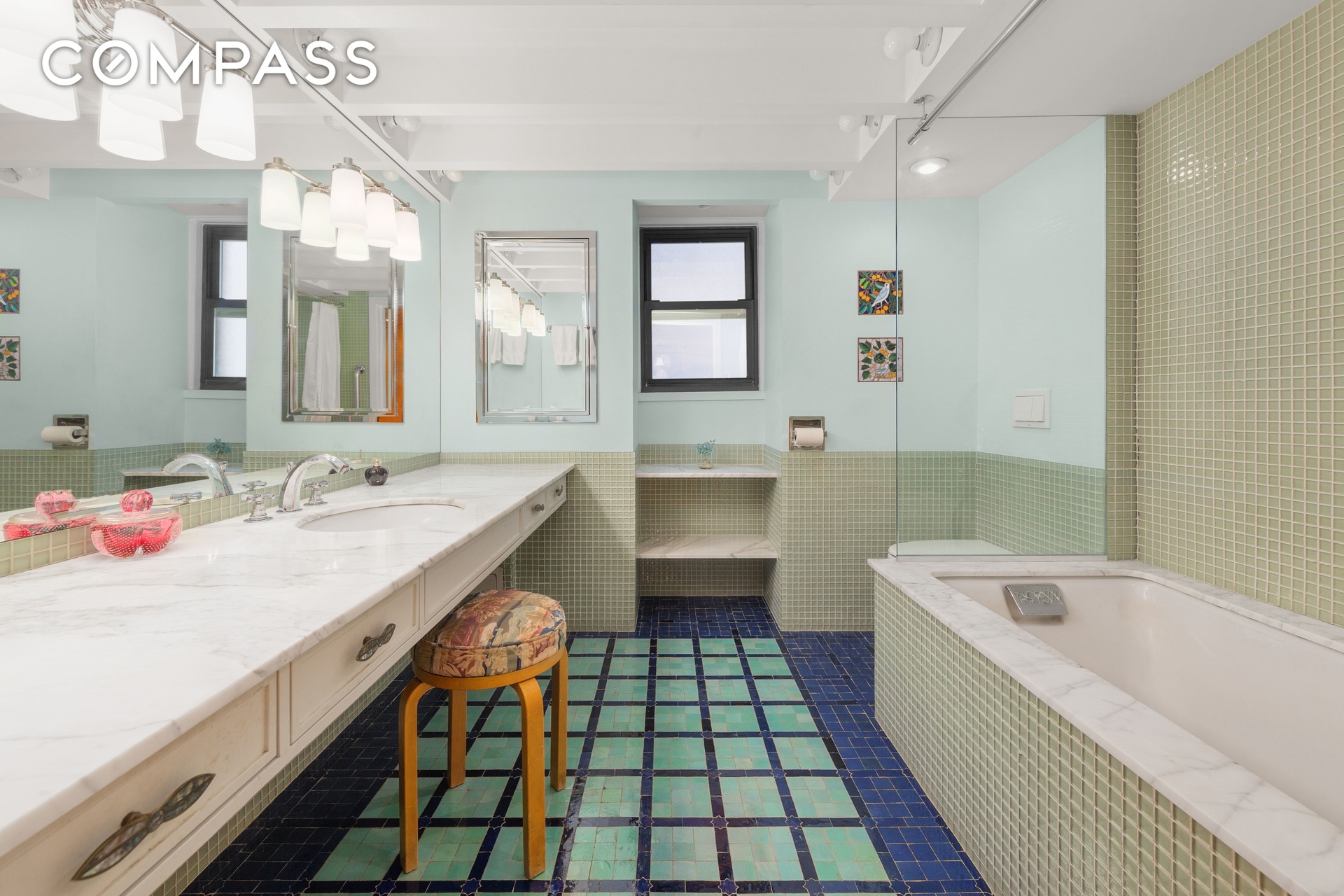 The primary bedroom is pin-drop quiet with western exposures. Six closets, including a generous walk-in, provide exceptional storage. The graciously sized ensuite windowed bathroom features a deep soaking tub, expansive white marble vanity, mosaic tile floors, a Toto toilet, and built-in shelving.