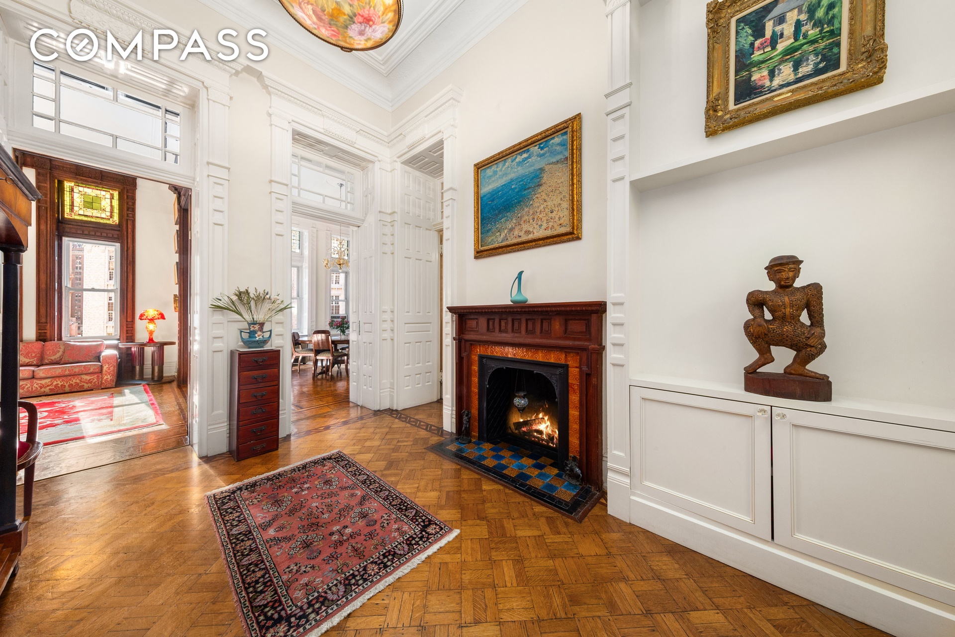 An exquisite entry foyer greets you with a stately woodburning fireplace. You will immediately notice this home's signature features — soaring 14 ft ceilings, original hand-nailed Parquet de Versailles oak floors, beautiful wood carvings, and glass transoms above doorways that have natural light spilling into every space.