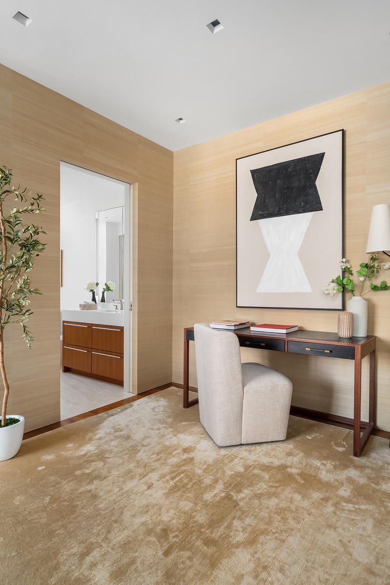 The chef's kitchen is bright and purposeful, boasting travertine counters in a sleek, continuous plane, a full suite of Miele and Sub-Zero appliances, and pocket pantry shelving. A full laundry room sits discreetly and conveniently adjacent. Equally suited as a home office or staff quarters, a bedroom sits off the kitchen and is served by its own powder room.