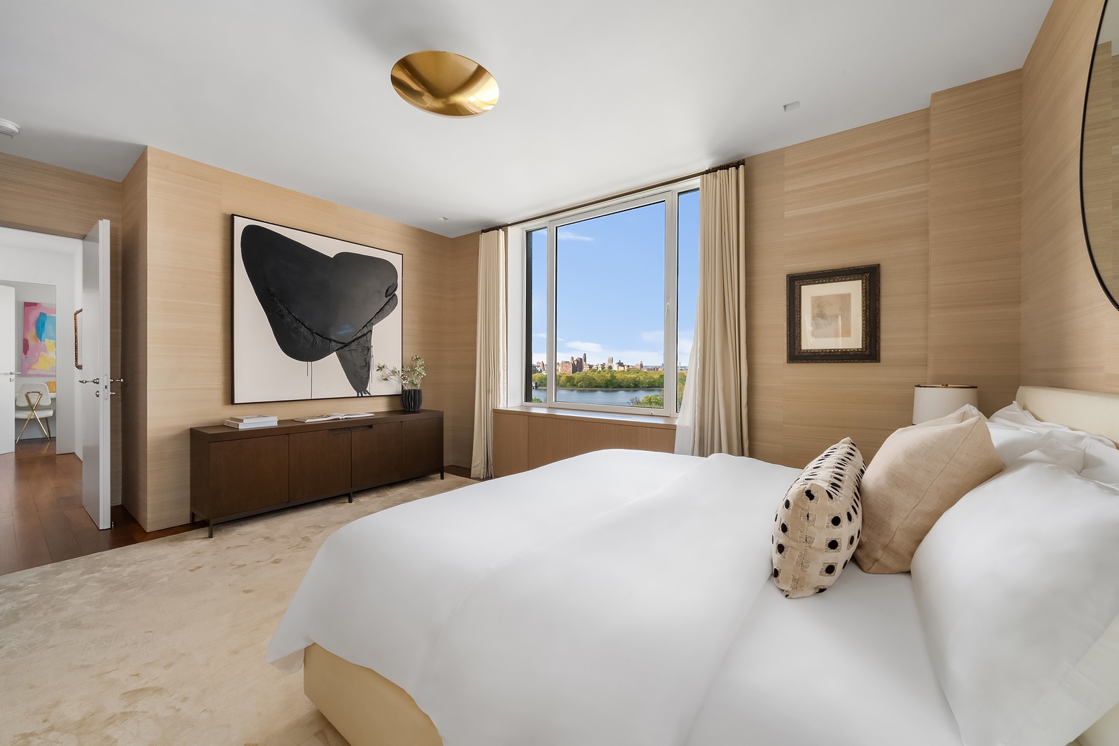 The sleeping quarters can be closed from the principal living spaces preserving privacy and tranquility. The palatial primary suite features a workspace or lounge area while oversized windows frame the Guggenheim and the full canopy of Central Park. The ensuite bath features a double-width shower, marble counters and a discreetly appointed and thoughtfully scaled walk-in closet.