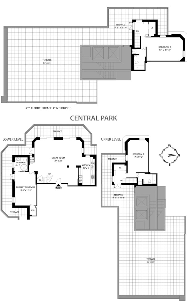 The sophisticated private quarters include a south-facing primary suite on the main lower level that offers sunny exposures , direct terrace access, and a beautifully finished bathroom with a Japanese soaking tub. A custom staircase with a hand-forged wrought iron banister leads to the upper level where there's an enormous private terrace, approximately 1,300 sq. ft. -ideal for grand-scale entertaining or peaceful solitude as well as a second bedroom complete with a luxurious en-suite bath.