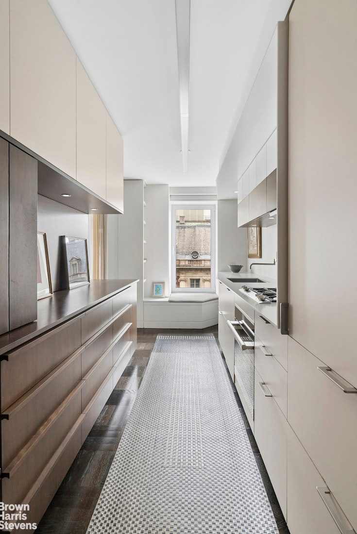 The windowed kitchen is a masterclass in both form and function, appointed with sleek Corian countertops and backsplash, bespoke walnut cabinetry & abundant storage. Premium appliances include a Gaggenau range,Miele dishwasher & Sub-Zero refrigerator with dual freezers, complemented by a separate pantry closet-perfectly suited for seamless daily living & effortless entertaining.