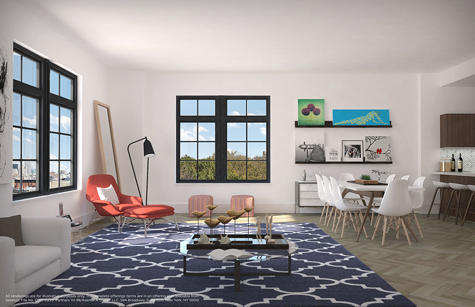 Designed by the esteemed architects of Isaac & Stern, 100 Avenue A is a vibrant new style of premium condominium living not yet seen on Tompkins Square Park. Situated on the corner of East 7th and Avenue A and surrounded by some of the city's most exciting restaurants like Pylos and Miss Lily's, the building reinvents full-service living in the East Village. Amenities will include a landscaped common roof deck with showers and the most spectacular views of the park and the surrounding neighborhood. If that's not enough, there's a second floor common garden, bicycle storage, residential storage bins for sale, and a 24-hour doorman. The lobby will be wrapped in Blue de Savoie marble slab, bronze-inlaid floors and Lumix quartzite wall tiles—with bronze inlays and walnut finishes installed with individual slats. The building will also house a brand new Blink fitness gym.