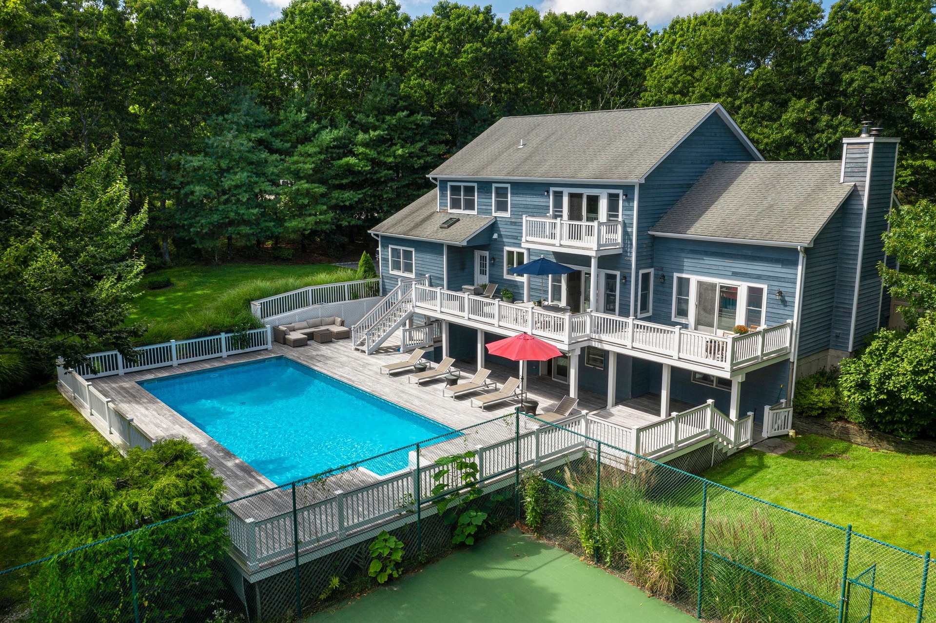 Spend your summer in this immaculate 5 bedroom, 4.5 bath home on a quiet street in Southampton North. Cathedral height living room with fireplace, new chef's kitchen with dining area, finished basement with family room and additional bedroom, heated pool, all weather tennis court and a generous deck for outdoor entertaining.