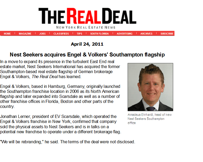 NEST SEEKERS INTERNATIONAL ACQUIRES ENGEL & VOLKERS IN THE HAMPTONS
