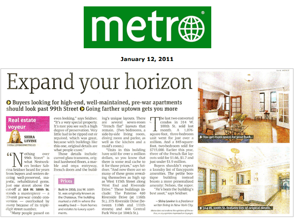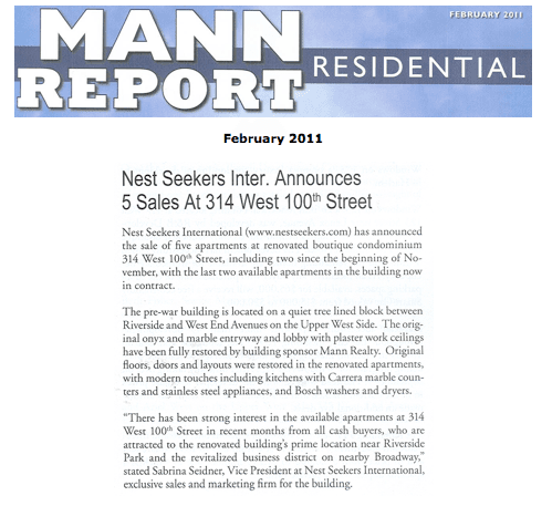 NEST SEEKERS ANNOUNCES 5 SALES AT 314 WEST 100TH STREET