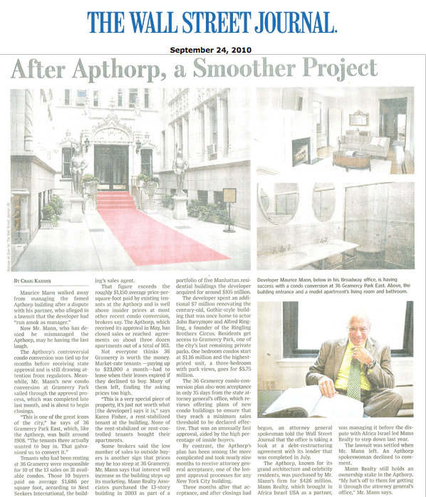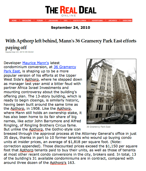 WITH APTHORP LEFT BEHIND, MANN'S 36 GRAMERCY PARK EAST EFFORTS PAYING OFF