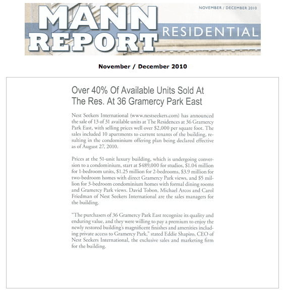 OVER 40% OF AVAILABLE UNITS SOLD AT THE RES. AT 36 GRAMERCY PARK EAST