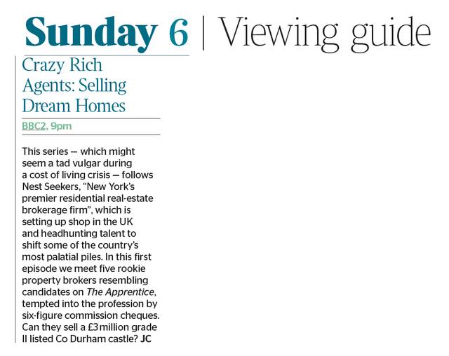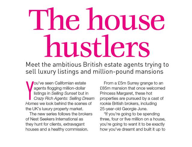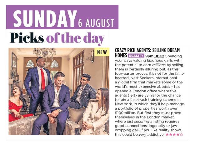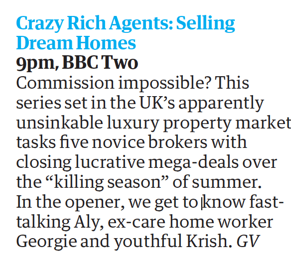 WHAT TO WATCH: CRAZY RICH AGENTS: SELLING DREAM HOMES BBC TWO, 9PM
