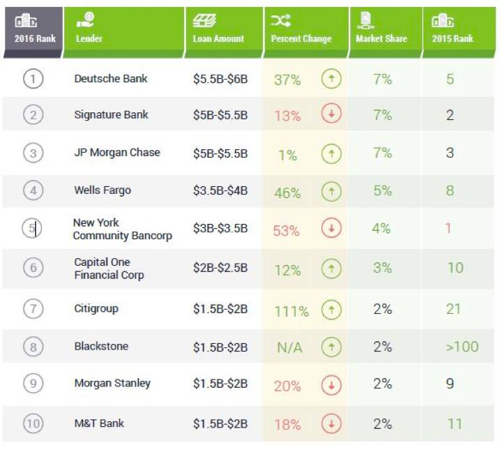 CrediFi’s report found both the top lenders as well the lower ranked ones for year 2016. Deutsche Bank, despite having a difficult year which included a $7.2 billion fine from the U.S. Justice Department, secured the spot as the largest commercial real estate lender for the year. This can be attributed to its growth in its origination volume by a rate of 46% as well as it increase in dole outs towards more NYC real estate projects by 37%. One of these projects includes a $396 million loan to Related Companies which is in charge of refinancing 85 10th Avenue—a Google Office which was also a former Oreo Factory.