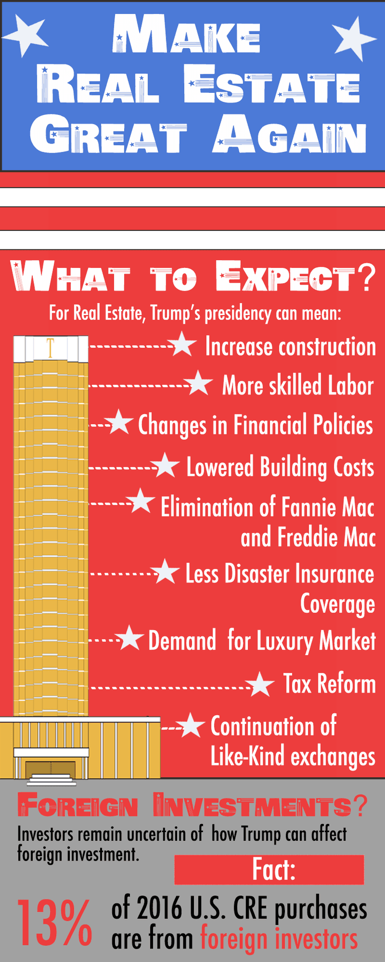While many of these predictions forecast friendly policies towards real estate market players, experts and analysts are also cautious with regards to foreign trade. With President-elect Trump’s protectionist policies, organizations such as the IMF and the Organization for Economic Cooperation and Development warned that these can cause a decrease in foreign investment for the U.S.— a potentially huge blow to the country’s commercial real estate sector. Only time will tell on whether these predictions are right and if President Trump’s promise—to “Make America Great Again”—extends to real estate development.