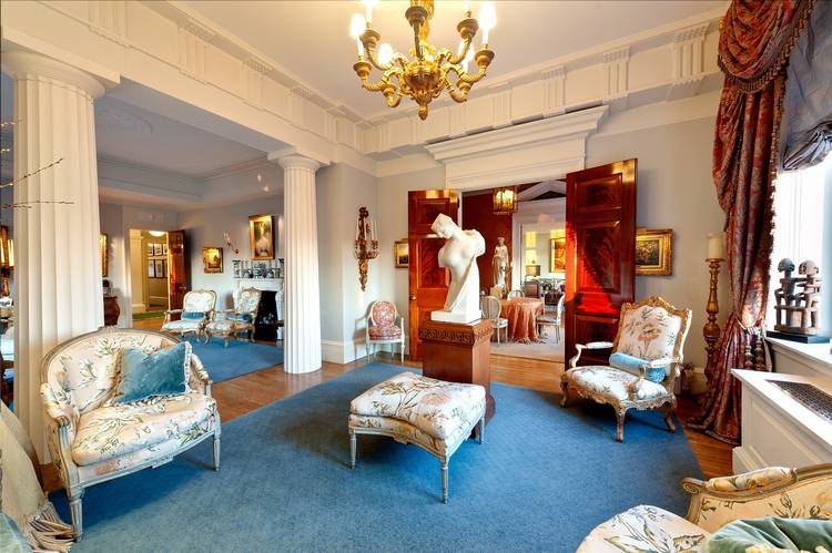 A mansion on the 12th floor of Holmes' new building, the 12-room 4,000 square-foot four-bedroom masterpiece is filled with modern photography by Robert Mapplethorpe, paintings by Hudson River School masters, and busts from ancient Greece and Rome. The fabric in the dining room is a reproduction of the same kind made specifically for the sister of Marie Antoinette.